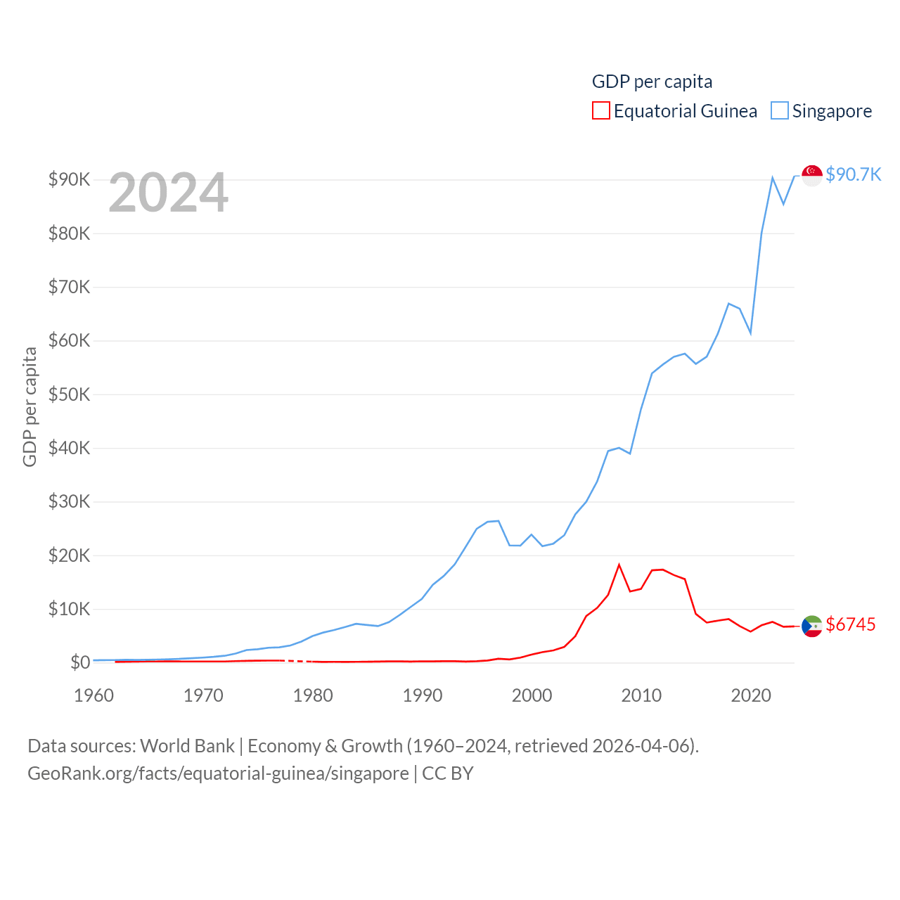 By GDP, Equatorial Guinea ranks 148/197 ($12.8B) and Singapore ranks 28/197 ($547B). By GDP per capita, Equatorial Guinea ranks 106/197 ($6,745), while Singapore ranks 7/197 ($90,674).