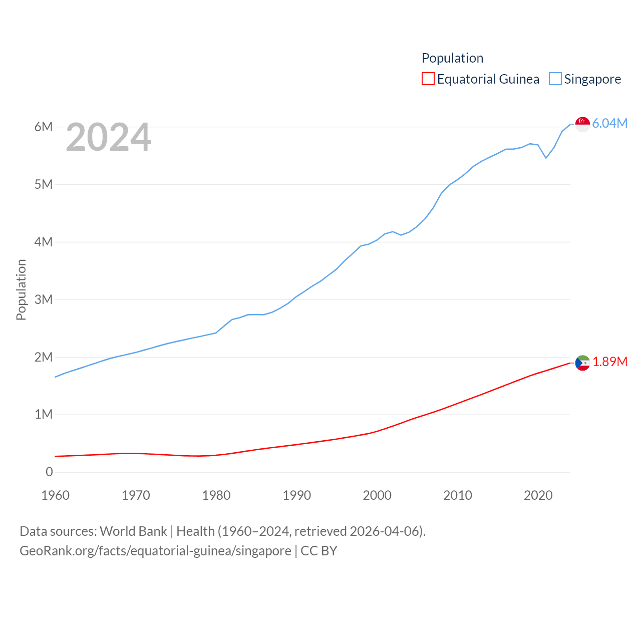 Equatorial Guinea has a population of 1.89M (ranked 148/197), compared with 6.04M in Singapore (ranked 113/197). Equatorial Guinea's land area is 10,830 sq mi versus 277.2 sq mi for Singapore (ranked 140th vs. 177th).