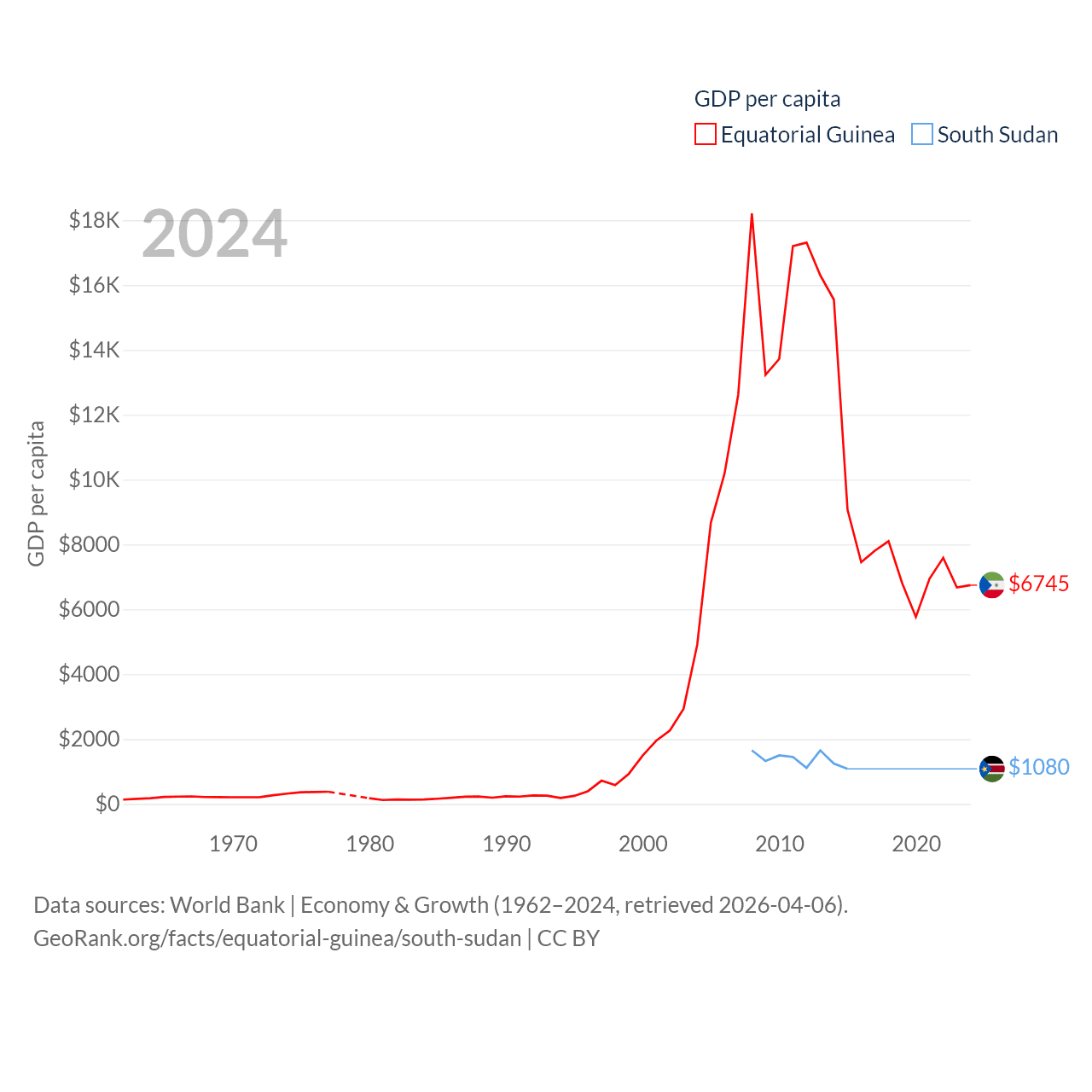 By GDP, Equatorial Guinea ranks 148/197 ($12.8B) and South Sudan ranks 149/197 ($12B). By GDP per capita, Equatorial Guinea ranks 106/197 ($6,745), while South Sudan ranks 175/197 ($1,080).