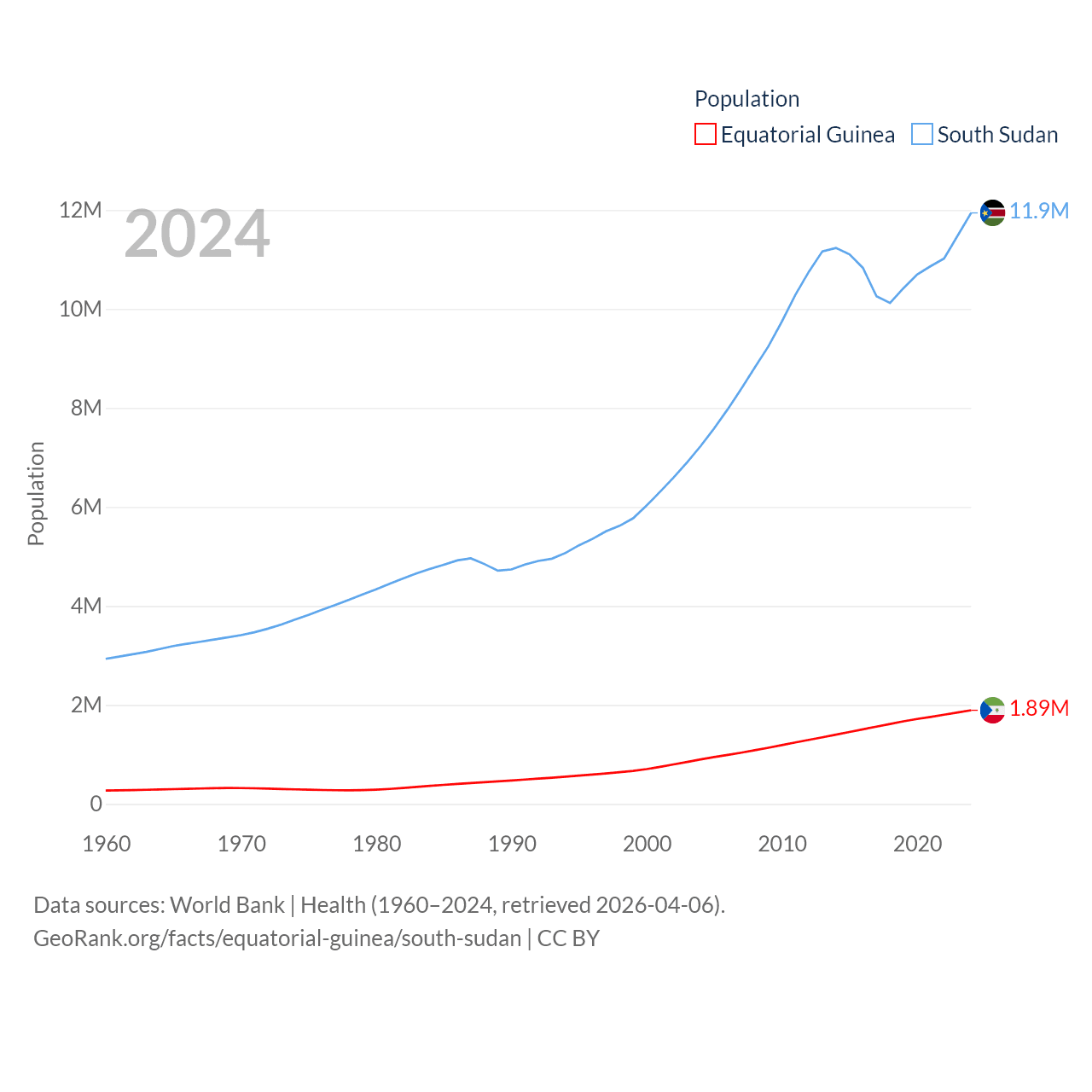 Equatorial Guinea has a population of 1.89M (ranked 148/197), compared with 11.9M in South Sudan (ranked 81/197). Equatorial Guinea's land area is 10,830 sq mi versus 243,990 sq mi for South Sudan (ranked 140th vs. 41st).