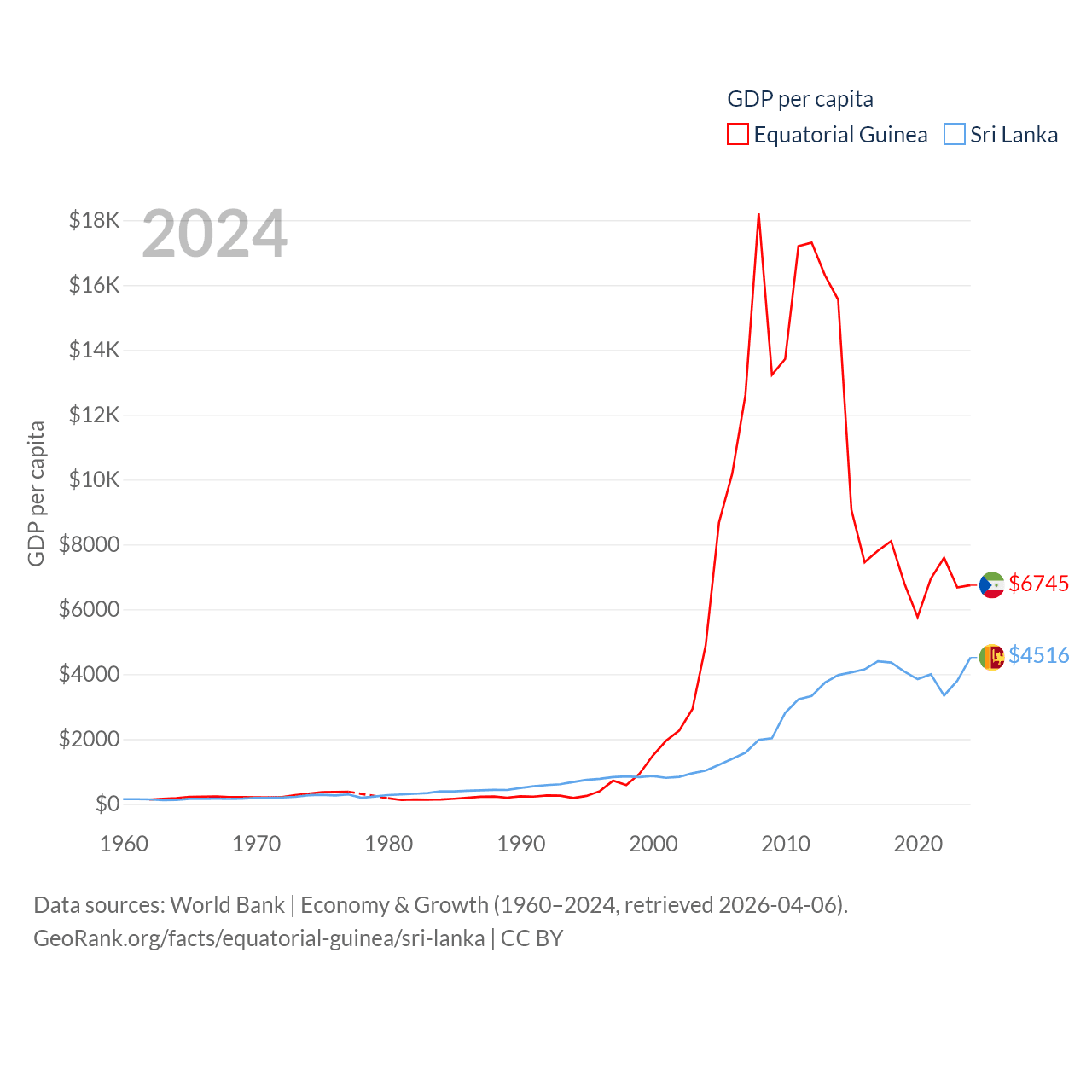 By GDP, Equatorial Guinea ranks 148/197 ($12.8B) and Sri Lanka ranks 72/197 ($99B). By GDP per capita, Equatorial Guinea ranks 106/197 ($6,745), while Sri Lanka ranks 124/197 ($4,516).