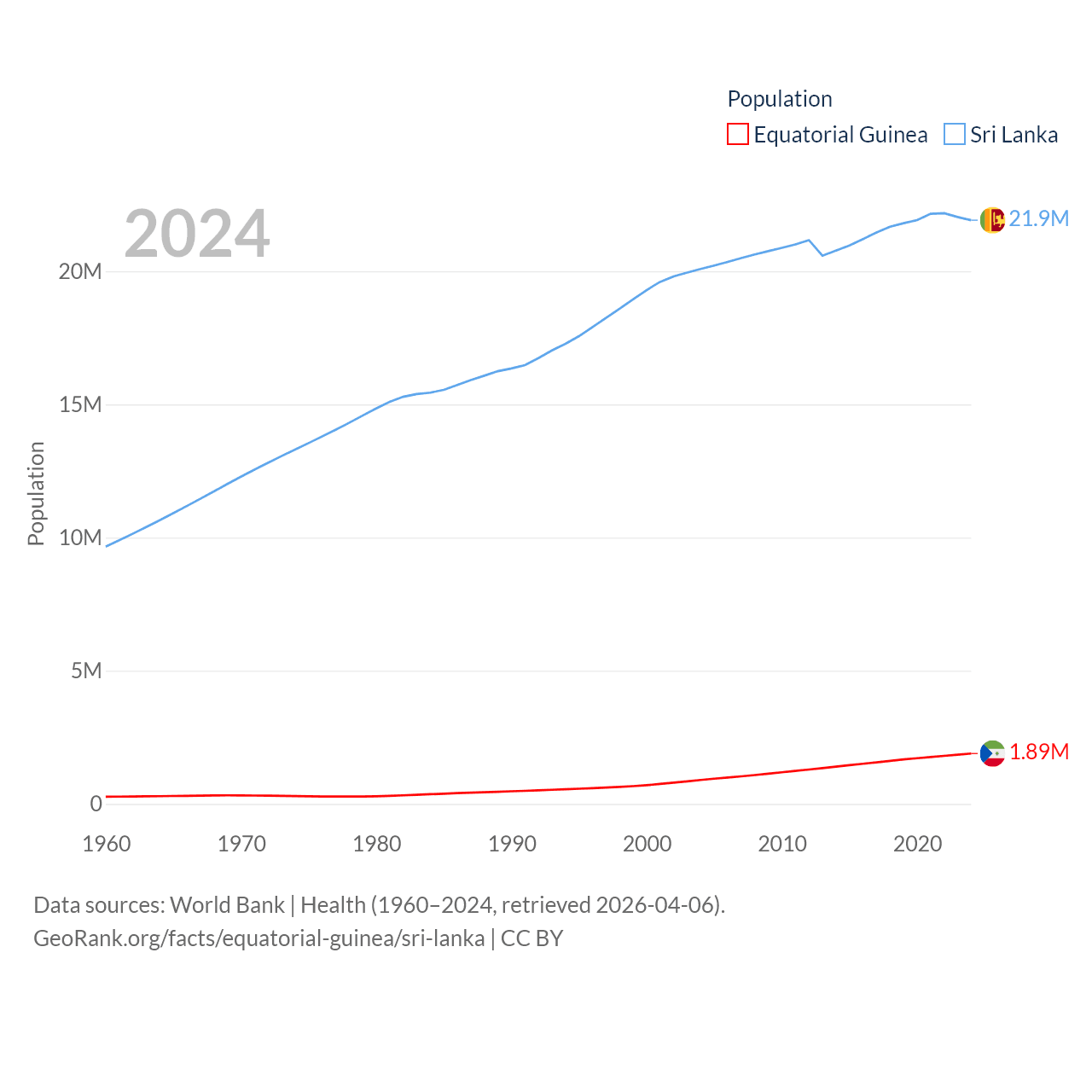 Equatorial Guinea has a population of 1.89M (ranked 148/197), compared with 21.9M in Sri Lanka (ranked 61/197). Equatorial Guinea's land area is 10,830 sq mi versus 23,884 sq mi for Sri Lanka (ranked 140th vs. 122nd).