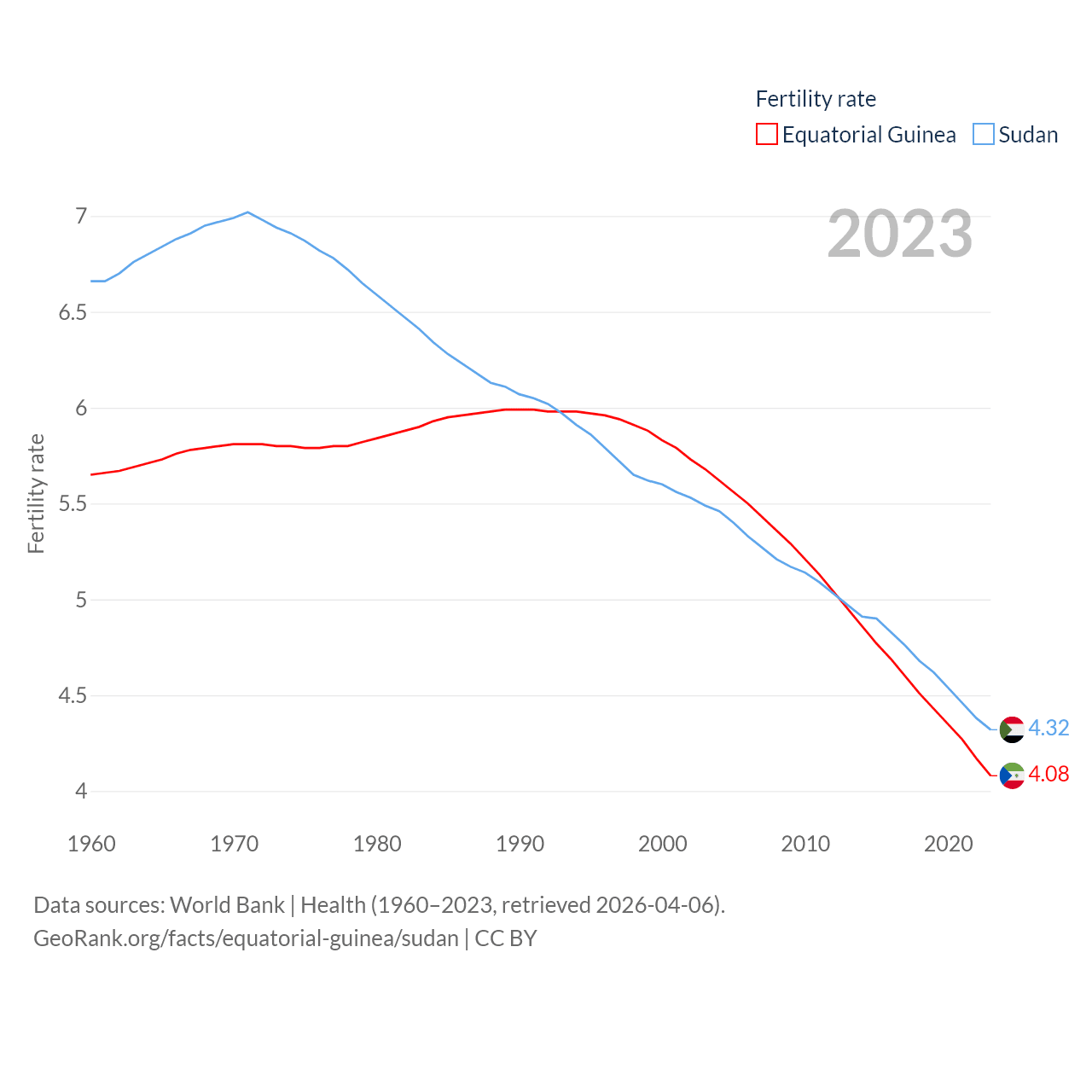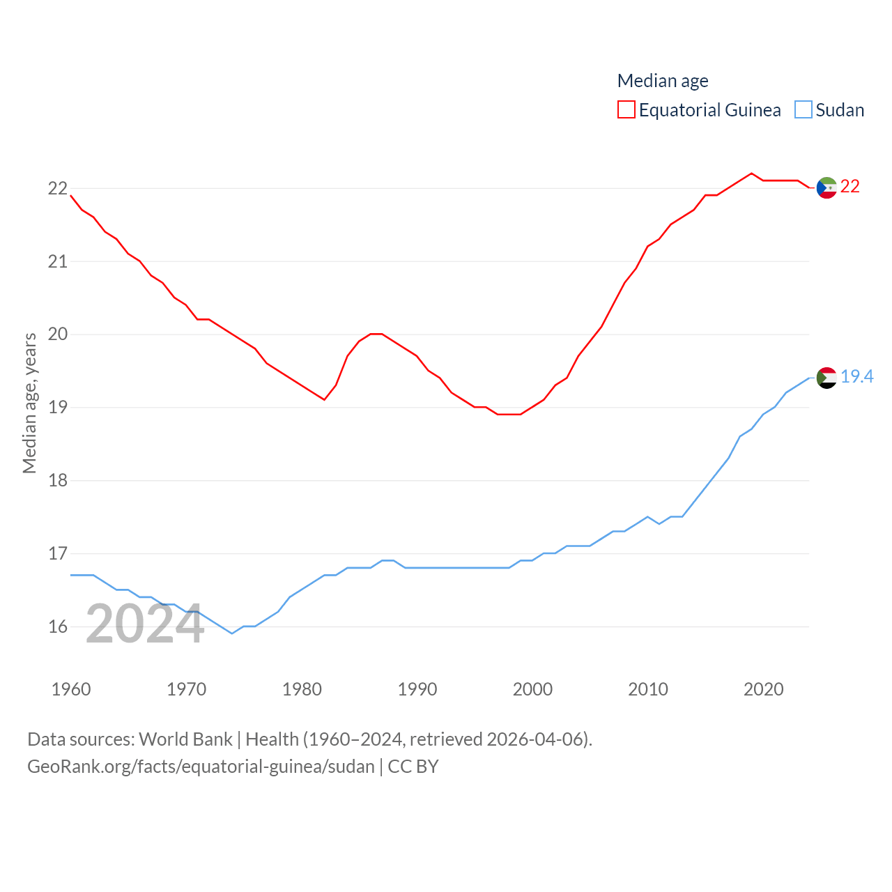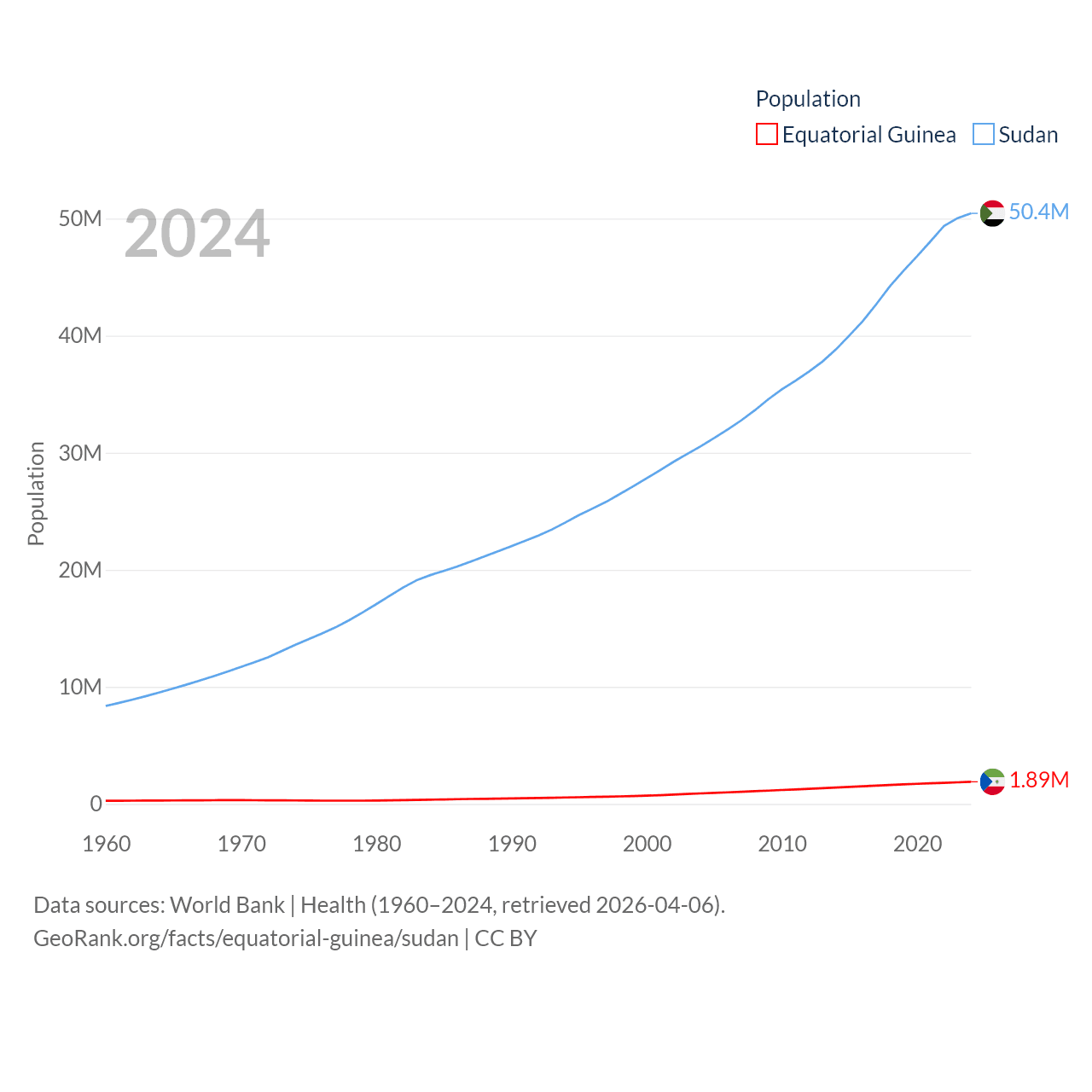 Equatorial Guinea has a population of 1.89M (ranked 148/197), compared with 50.4M in Sudan (ranked 30/197). Equatorial Guinea's land area is 10,830 sq mi versus 721,239 sq mi for Sudan (ranked 140th vs. 15th).