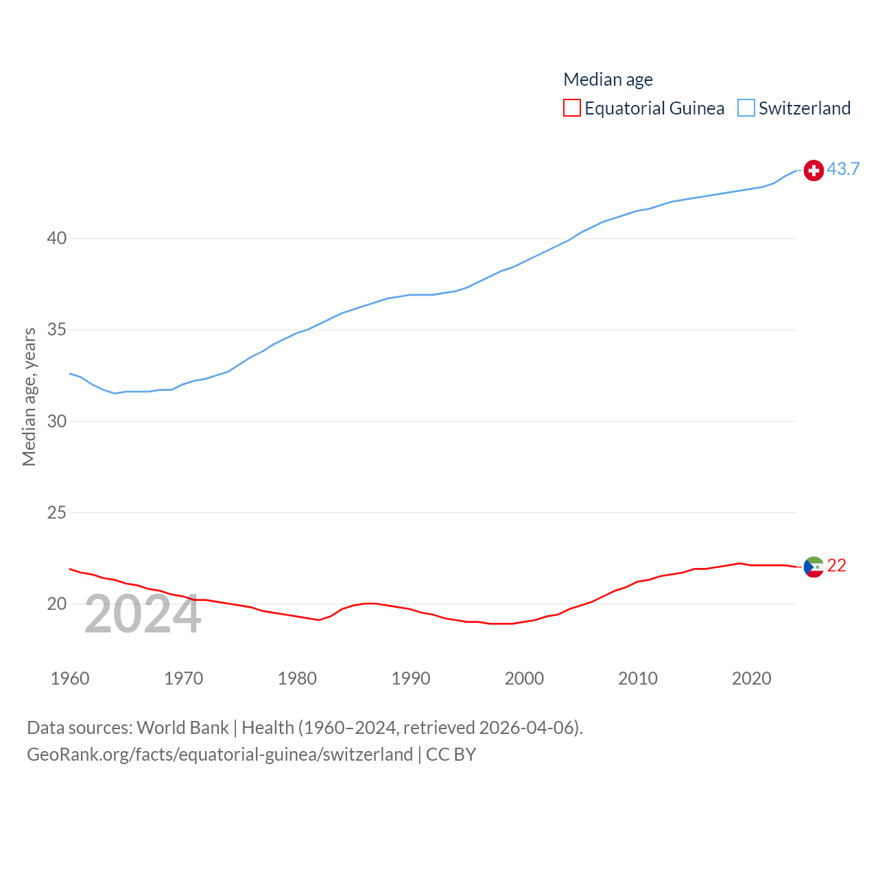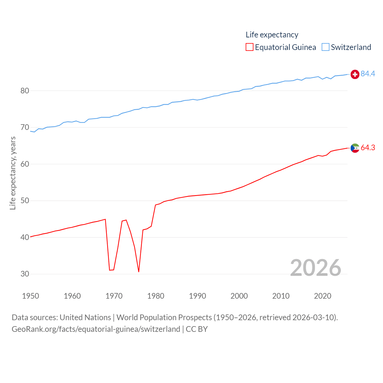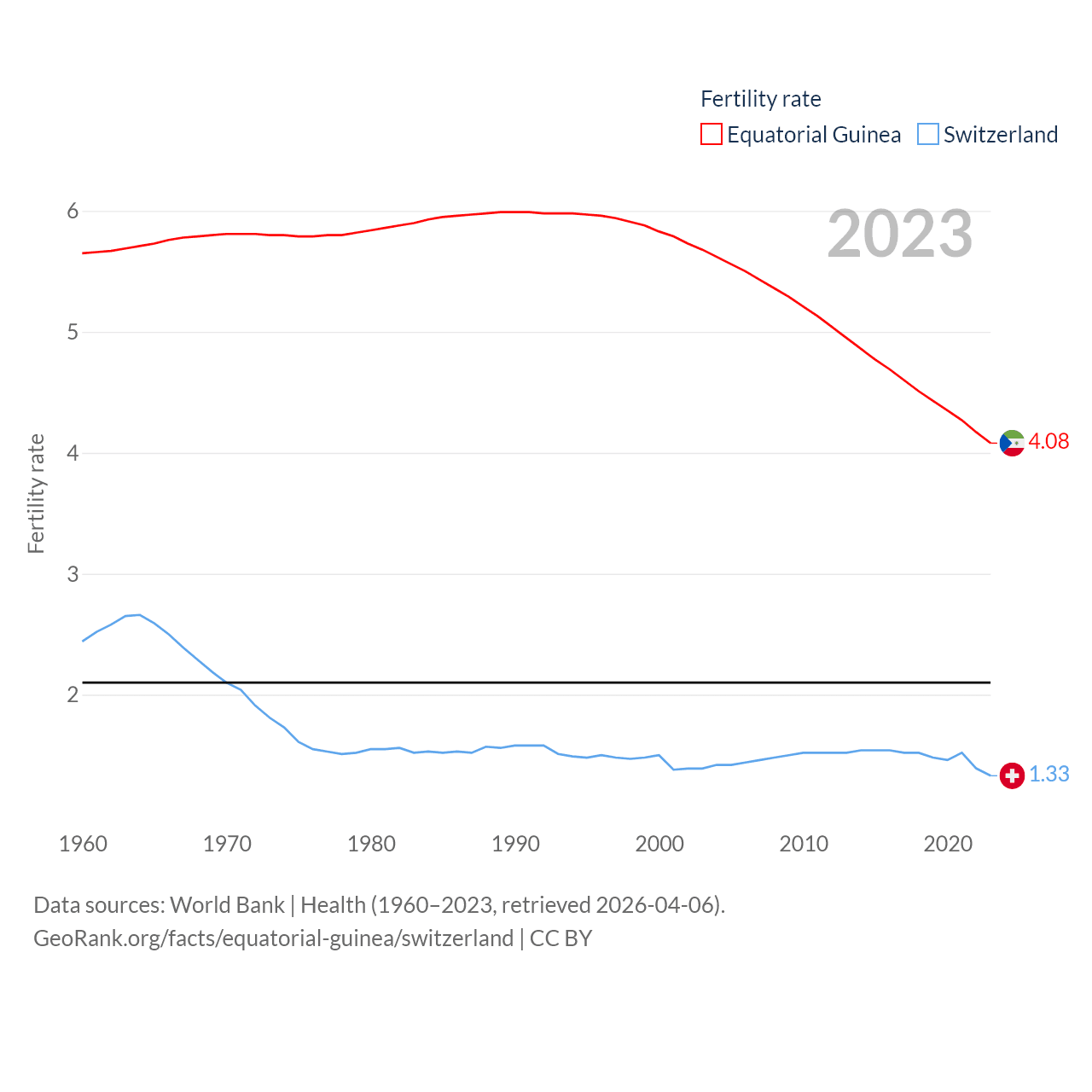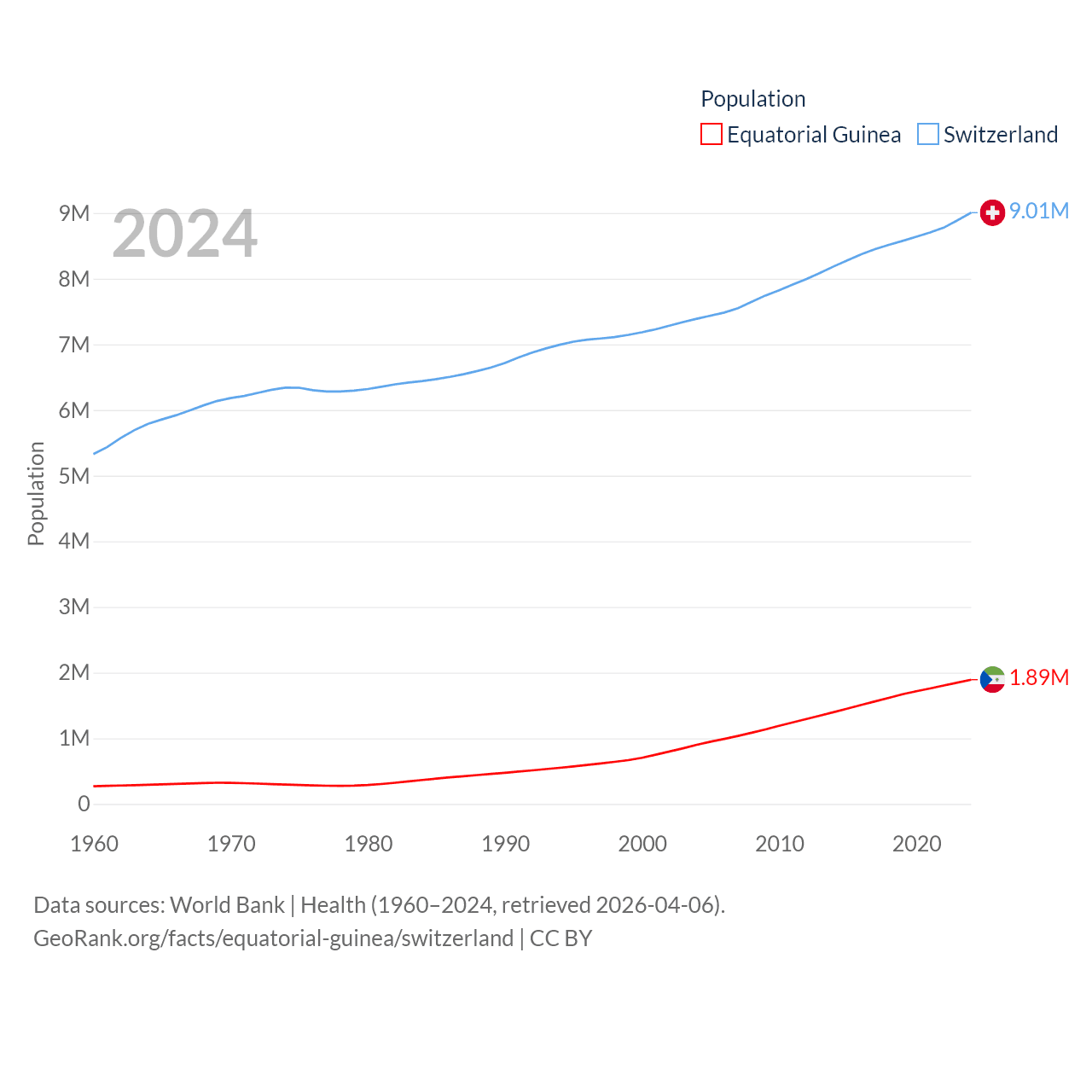 Equatorial Guinea has a population of 1.89M (ranked 148/197), compared with 9.01M in Switzerland (ranked 101/197). Equatorial Guinea's land area is 10,830 sq mi versus 15,255 sq mi for Switzerland (ranked 140th vs. 131st).