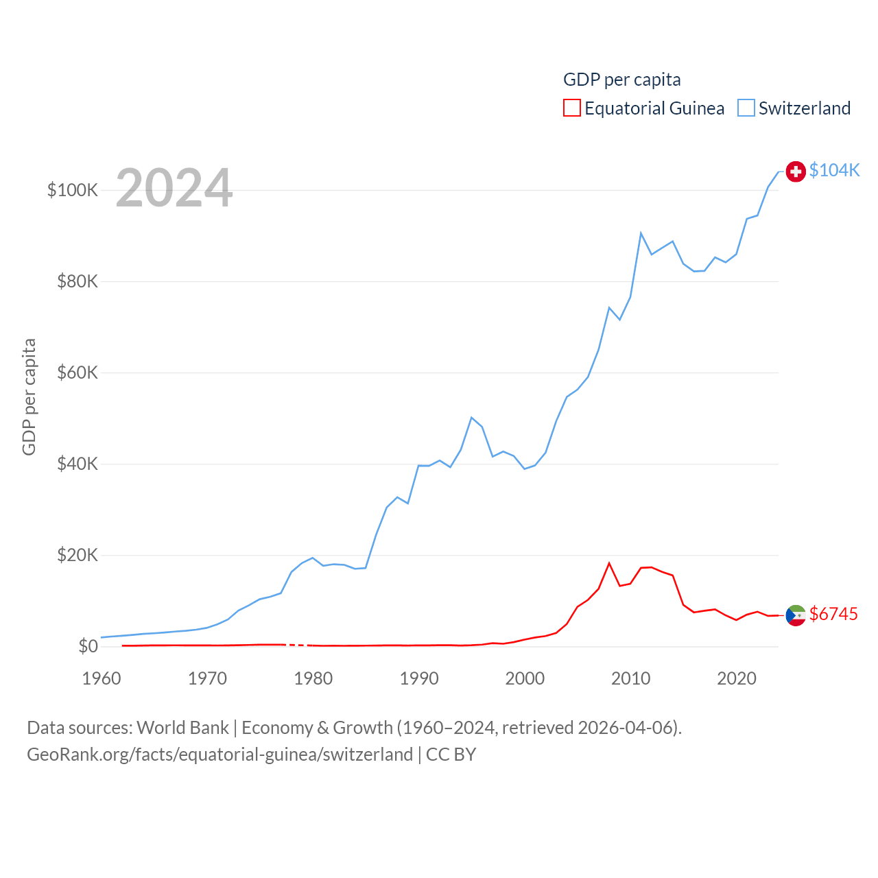 By GDP, Equatorial Guinea ranks 148/197 ($12.8B) and Switzerland ranks 20/197 ($937B). By GDP per capita, Equatorial Guinea ranks 106/197 ($6,745), while Switzerland ranks 5/197 ($103,998).