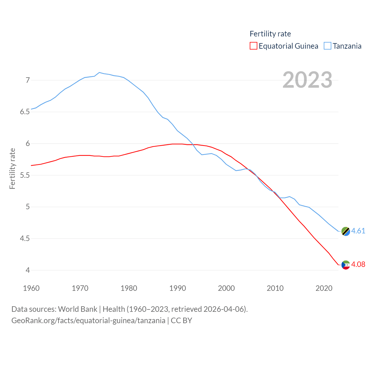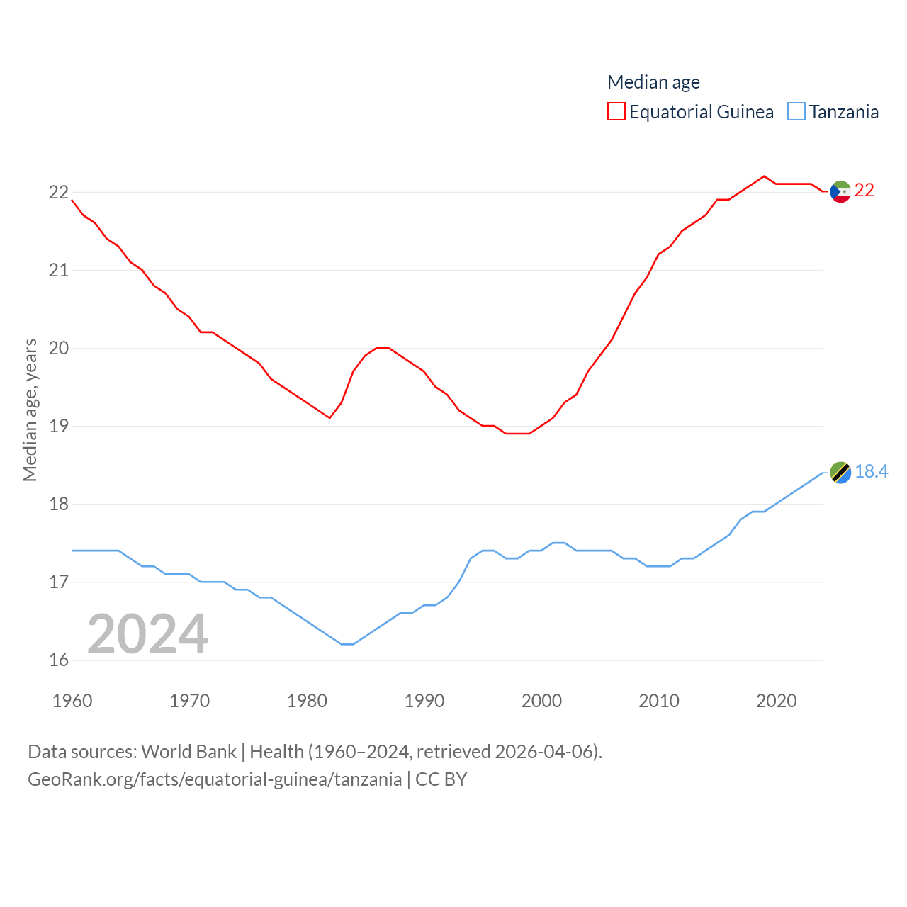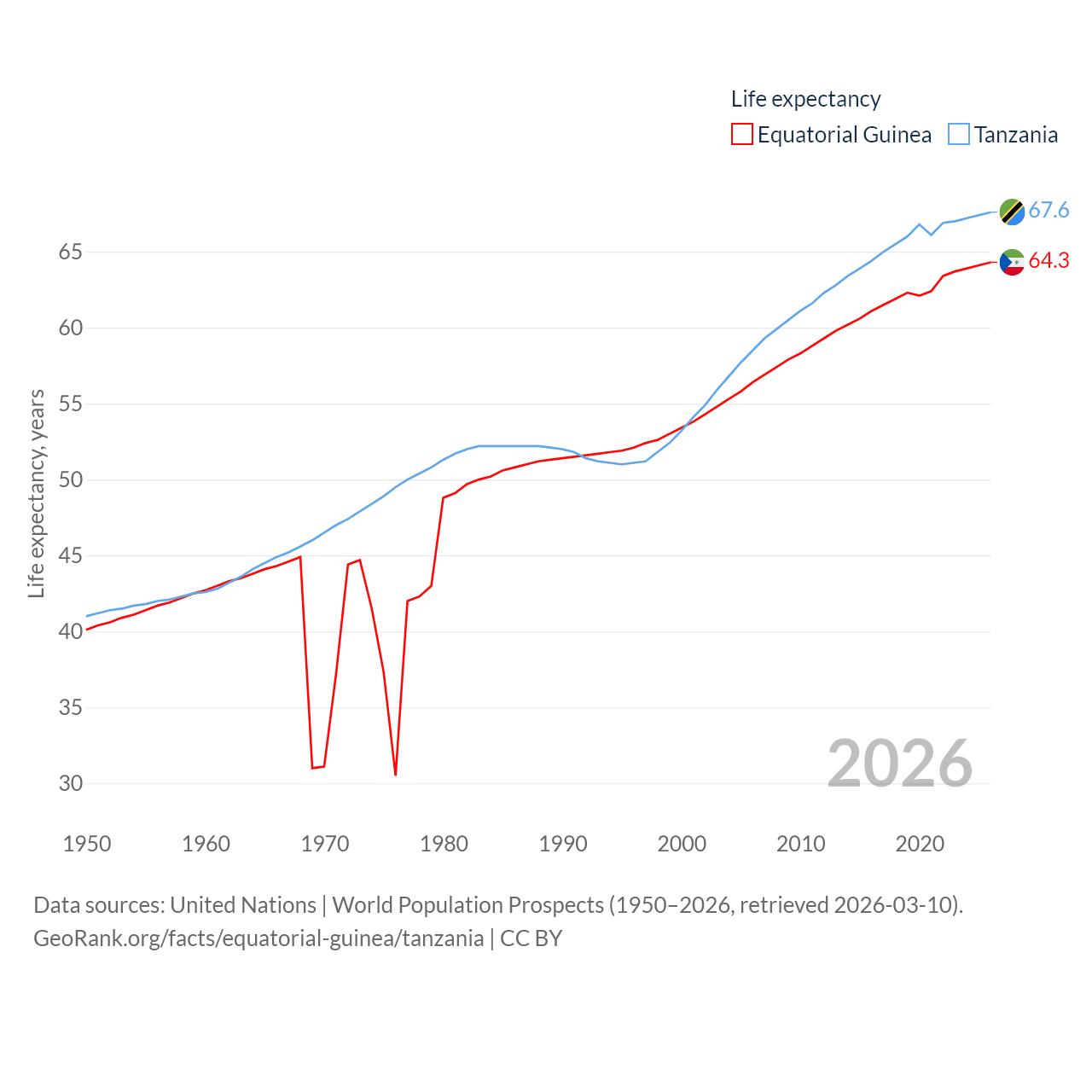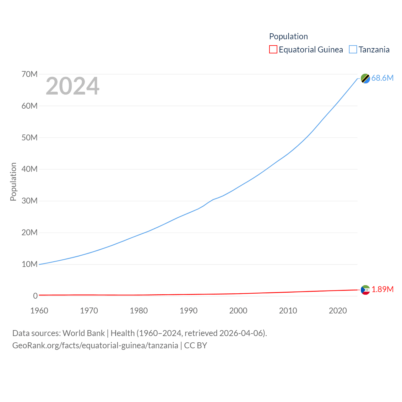 Equatorial Guinea has a population of 1.89M (ranked 148/197), compared with 68.6M in Tanzania (ranked 22/197). Equatorial Guinea's land area is 10,830 sq mi versus 342,009 sq mi for Tanzania (ranked 140th vs. 31st).