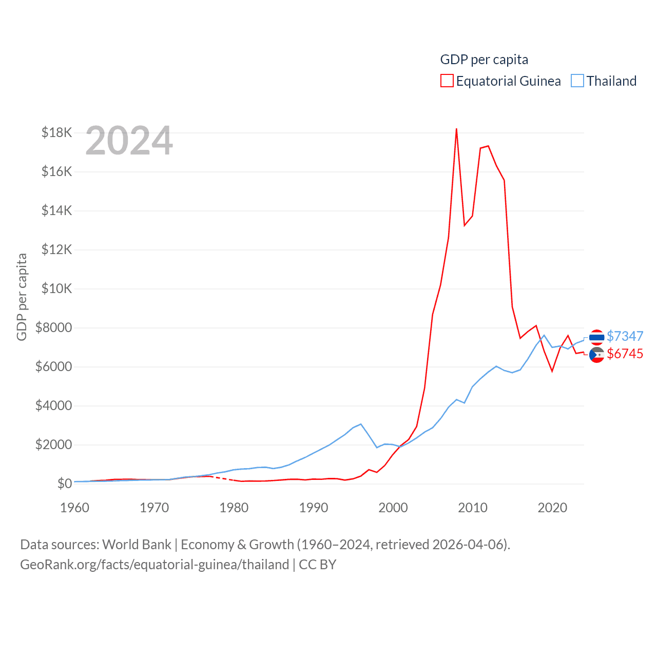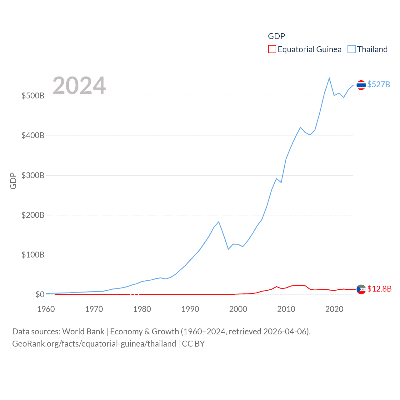 By GDP, Equatorial Guinea ranks 148/197 ($12.8B) and Thailand ranks 31/197 ($527B). By GDP per capita, Equatorial Guinea ranks 106/197 ($6,745), while Thailand ranks 100/197 ($7,347).