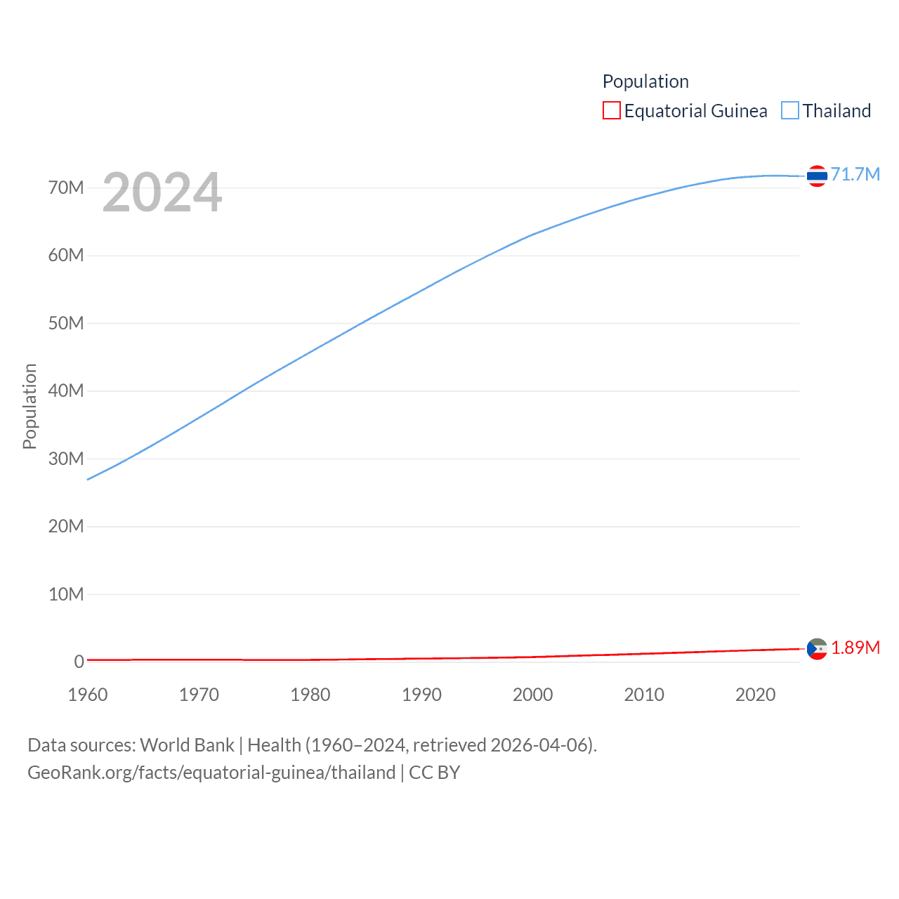 Equatorial Guinea has a population of 1.89M (ranked 148/197), compared with 71.7M in Thailand (ranked 20/197). Equatorial Guinea's land area is 10,830 sq mi versus 197,256 sq mi for Thailand (ranked 140th vs. 50th).