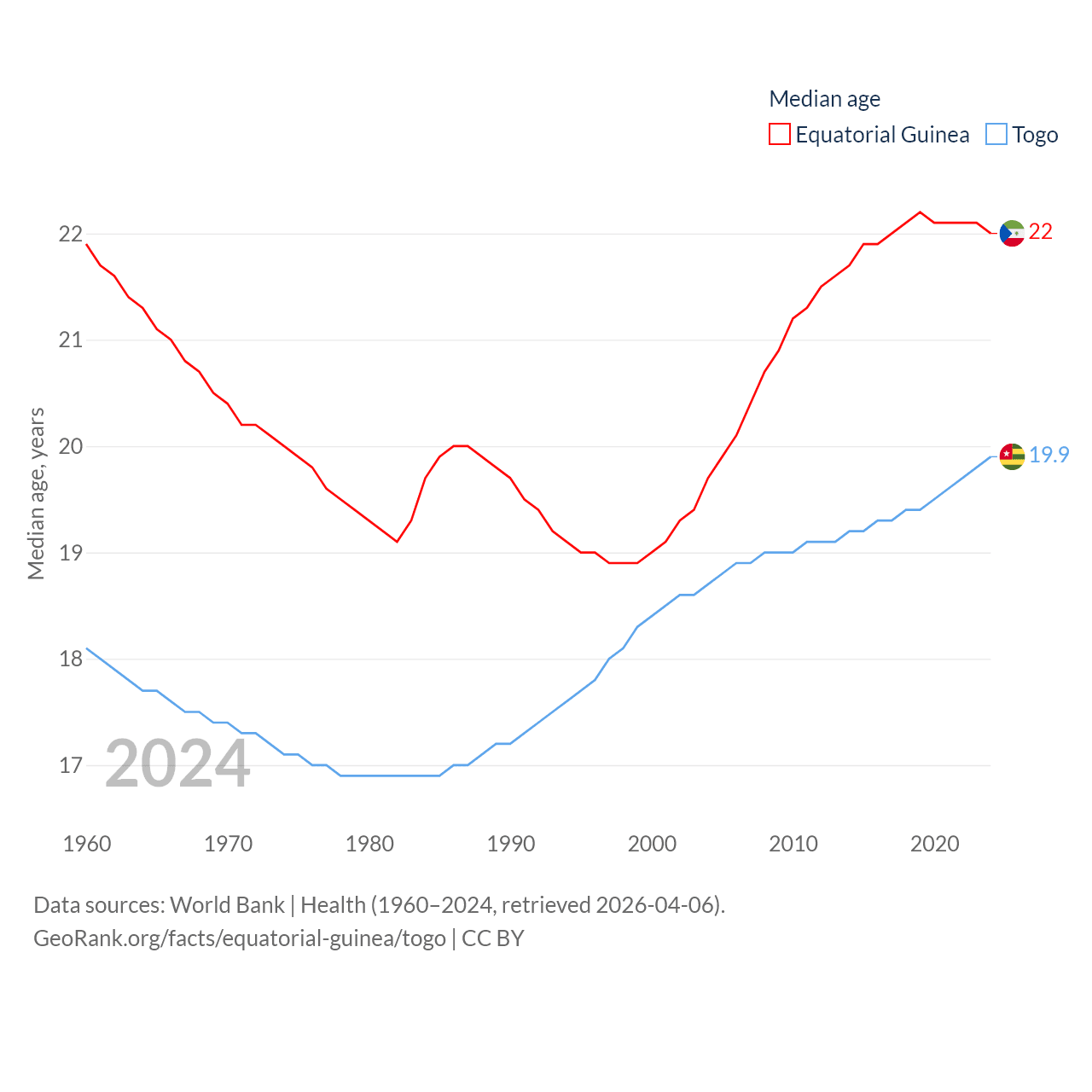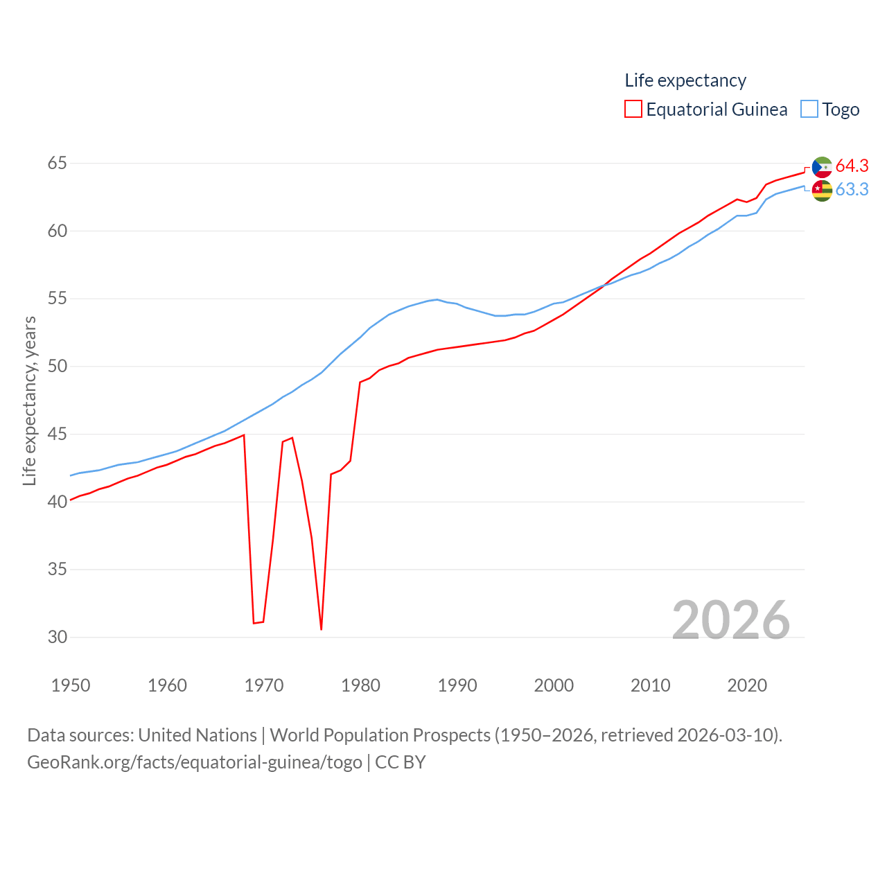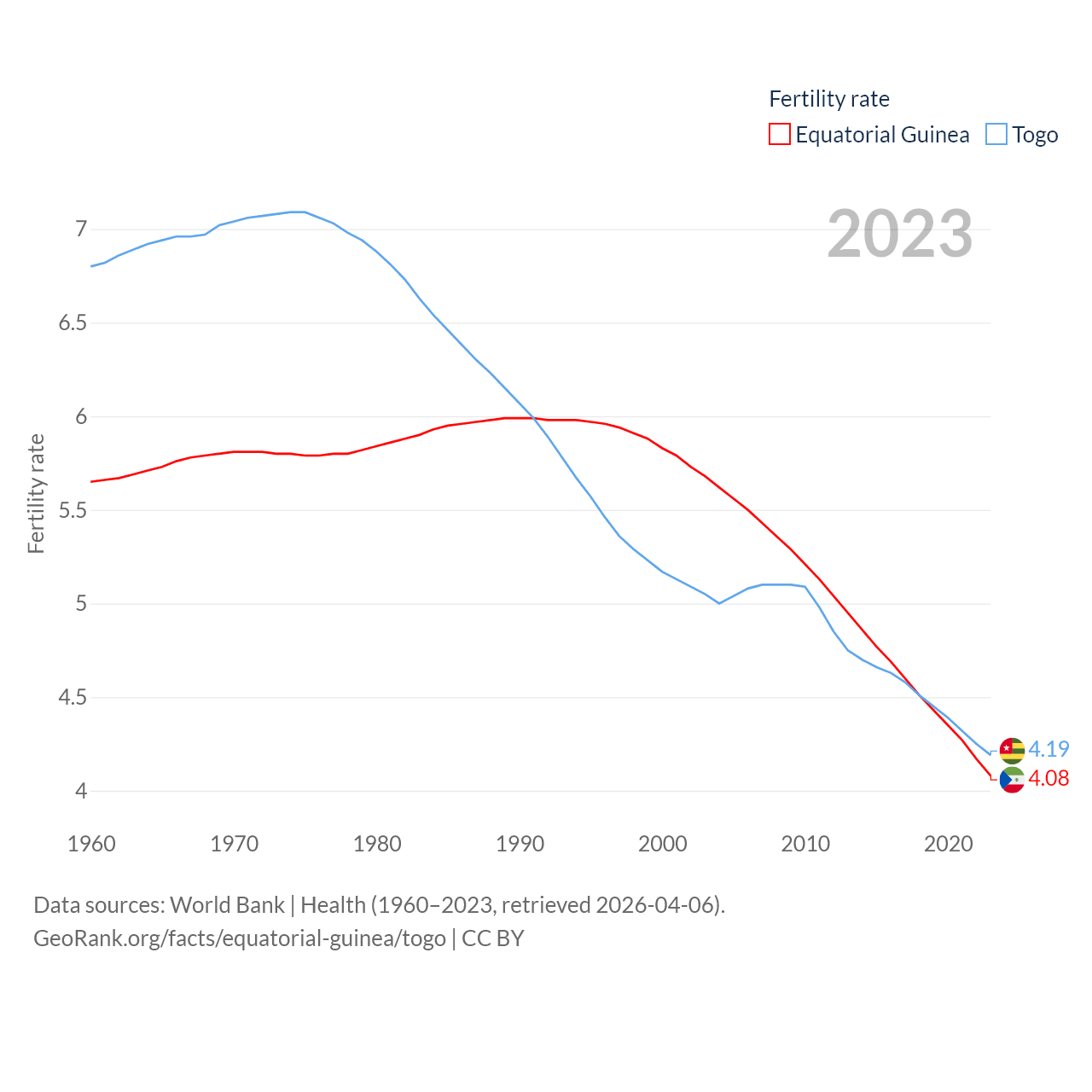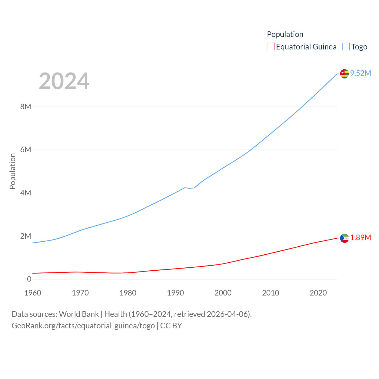 Equatorial Guinea has a population of 1.89M (ranked 148/197), compared with 9.52M in Togo (ranked 98/197). Equatorial Guinea's land area is 10,830 sq mi versus 21,000 sq mi for Togo (ranked 140th vs. 124th).