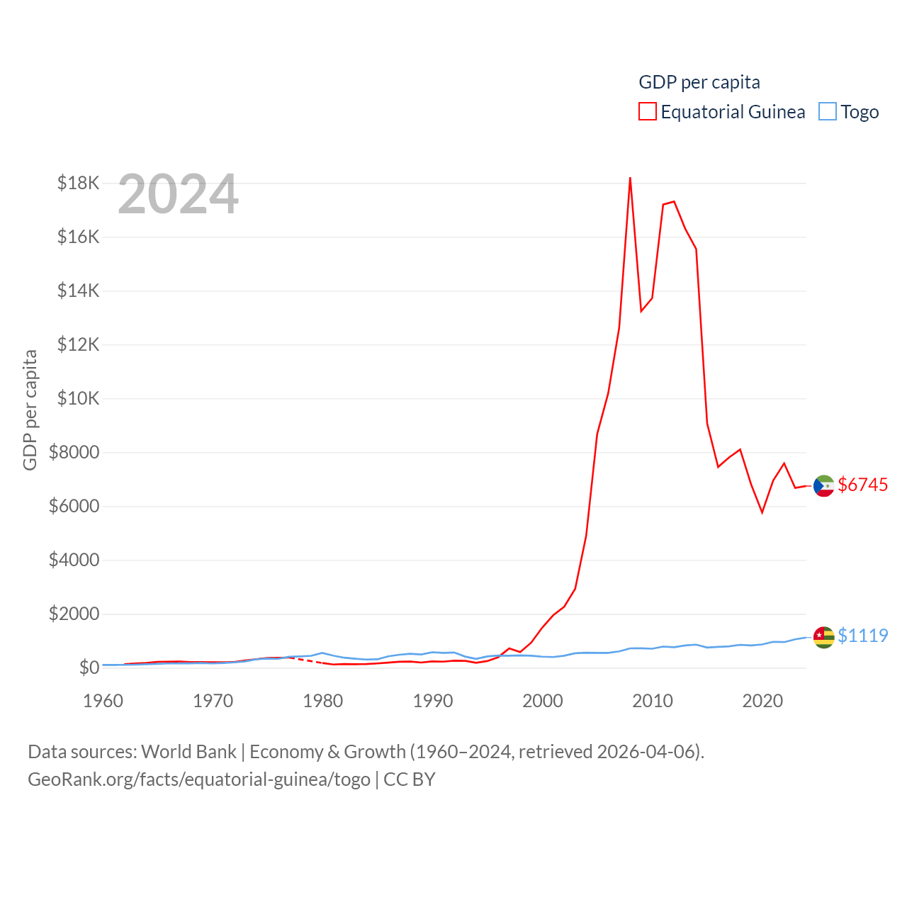 By GDP, Equatorial Guinea ranks 148/197 ($12.8B) and Togo ranks 154/197 ($10.7B). By GDP per capita, Equatorial Guinea ranks 106/197 ($6,745), while Togo ranks 172/197 ($1,119).