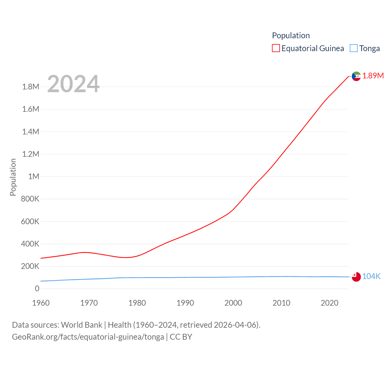 Equatorial Guinea has a population of 1.89M (ranked 148/197), compared with 104K in Tonga (ranked 183/197). Equatorial Guinea's land area is 10,830 sq mi versus 278 sq mi for Tonga (ranked 140th vs. 176th).