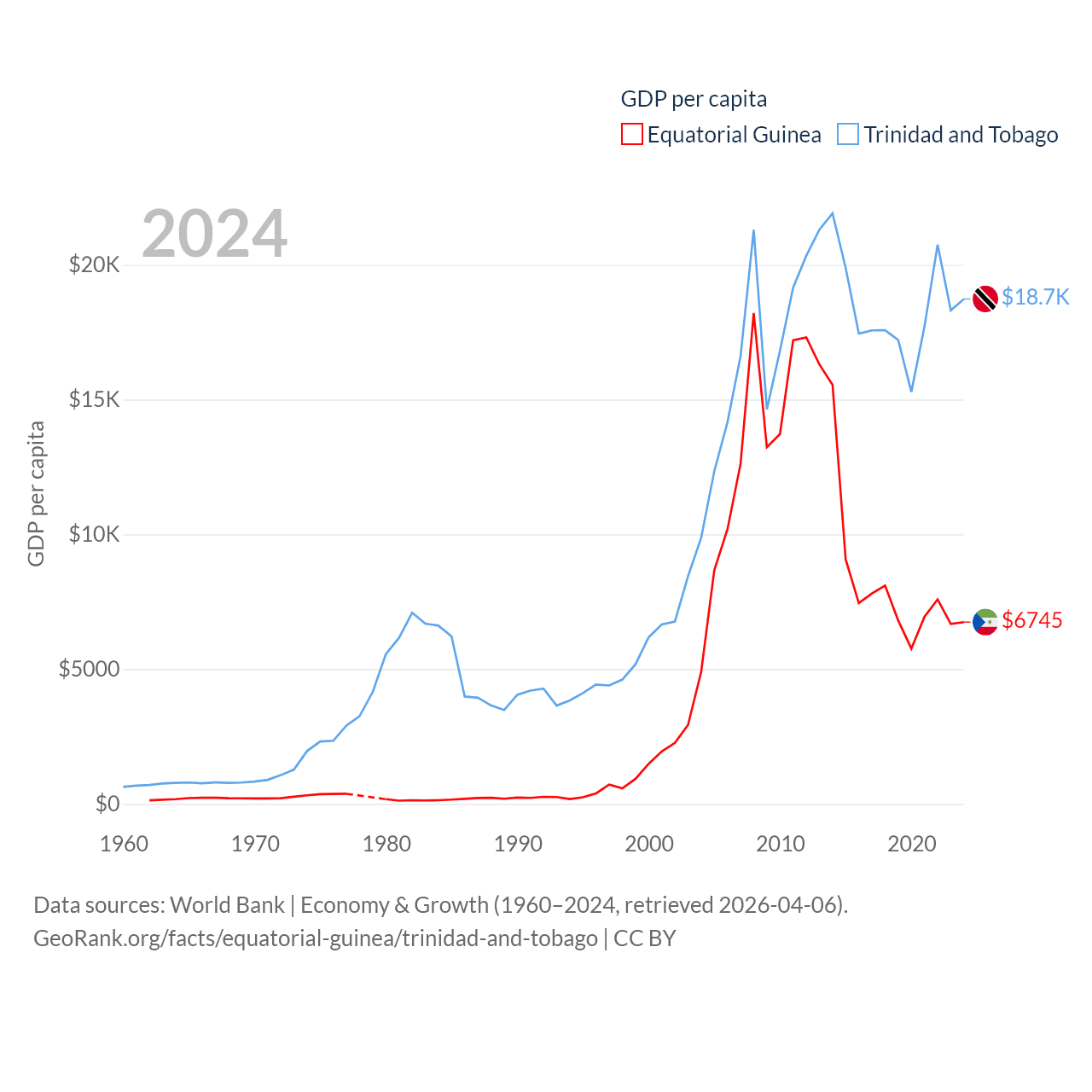 By GDP, Equatorial Guinea ranks 148/197 ($12.8B) and Trinidad and Tobago ranks 115/197 ($25.6B). By GDP per capita, Equatorial Guinea ranks 106/197 ($6,745), while Trinidad and Tobago ranks 61/197 ($18,733).