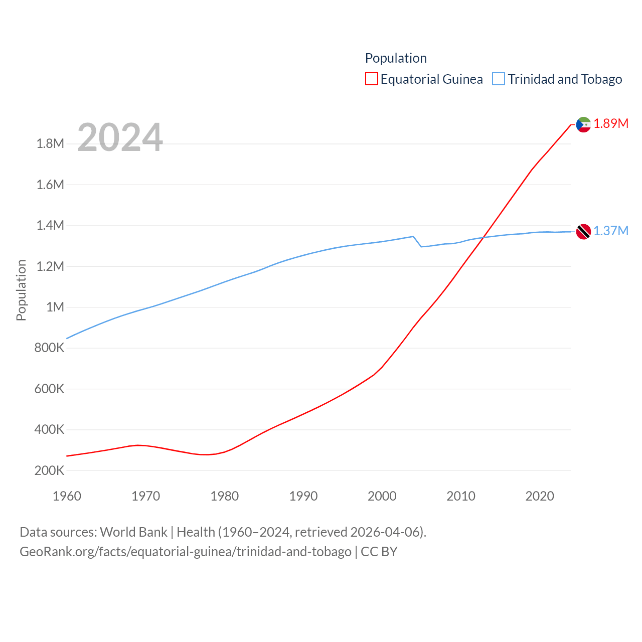 Equatorial Guinea has a population of 1.89M (ranked 148/197), compared with 1.37M in Trinidad and Tobago (ranked 154/197). Equatorial Guinea's land area is 10,830 sq mi versus 1,981 sq mi for Trinidad and Tobago (ranked 140th vs. 166th).