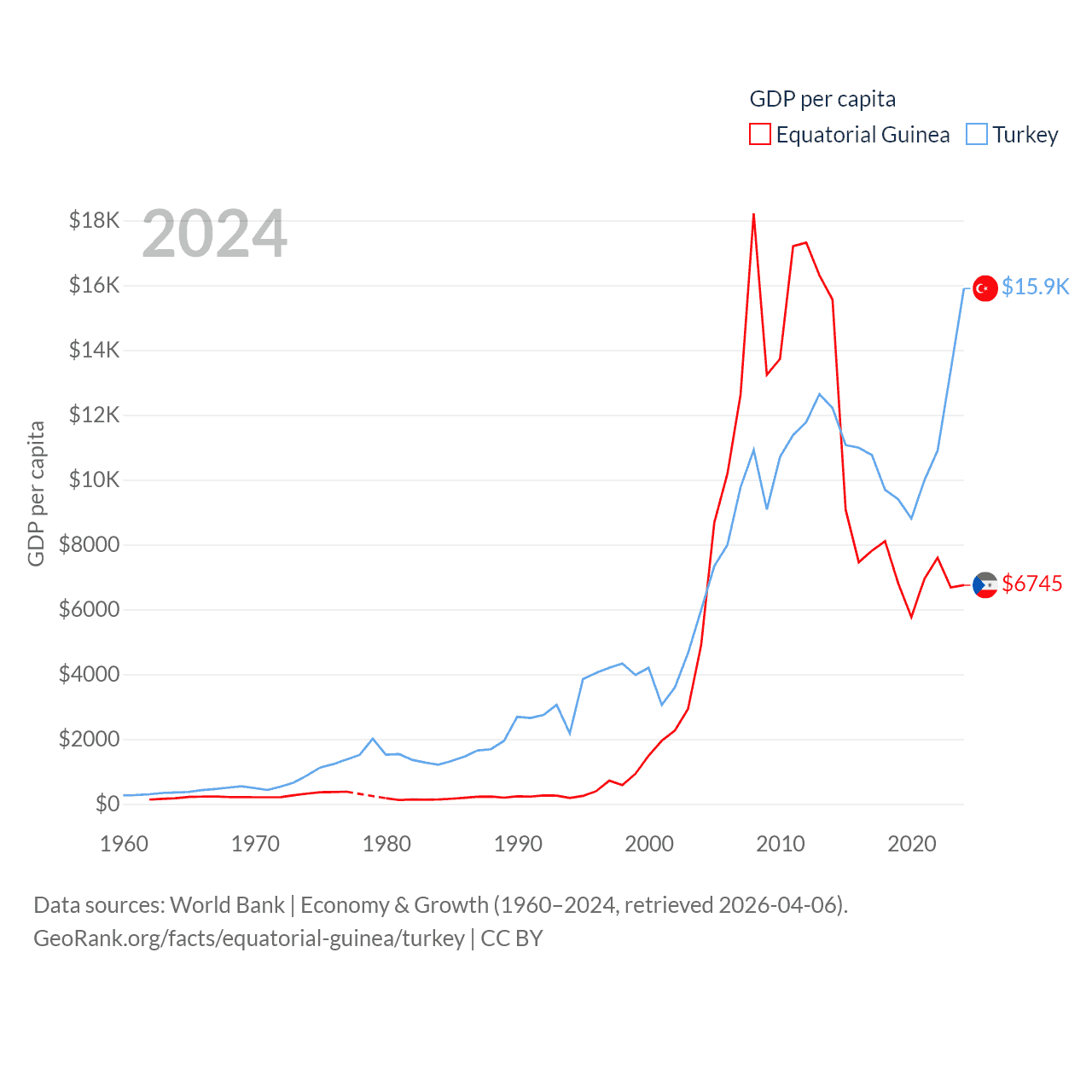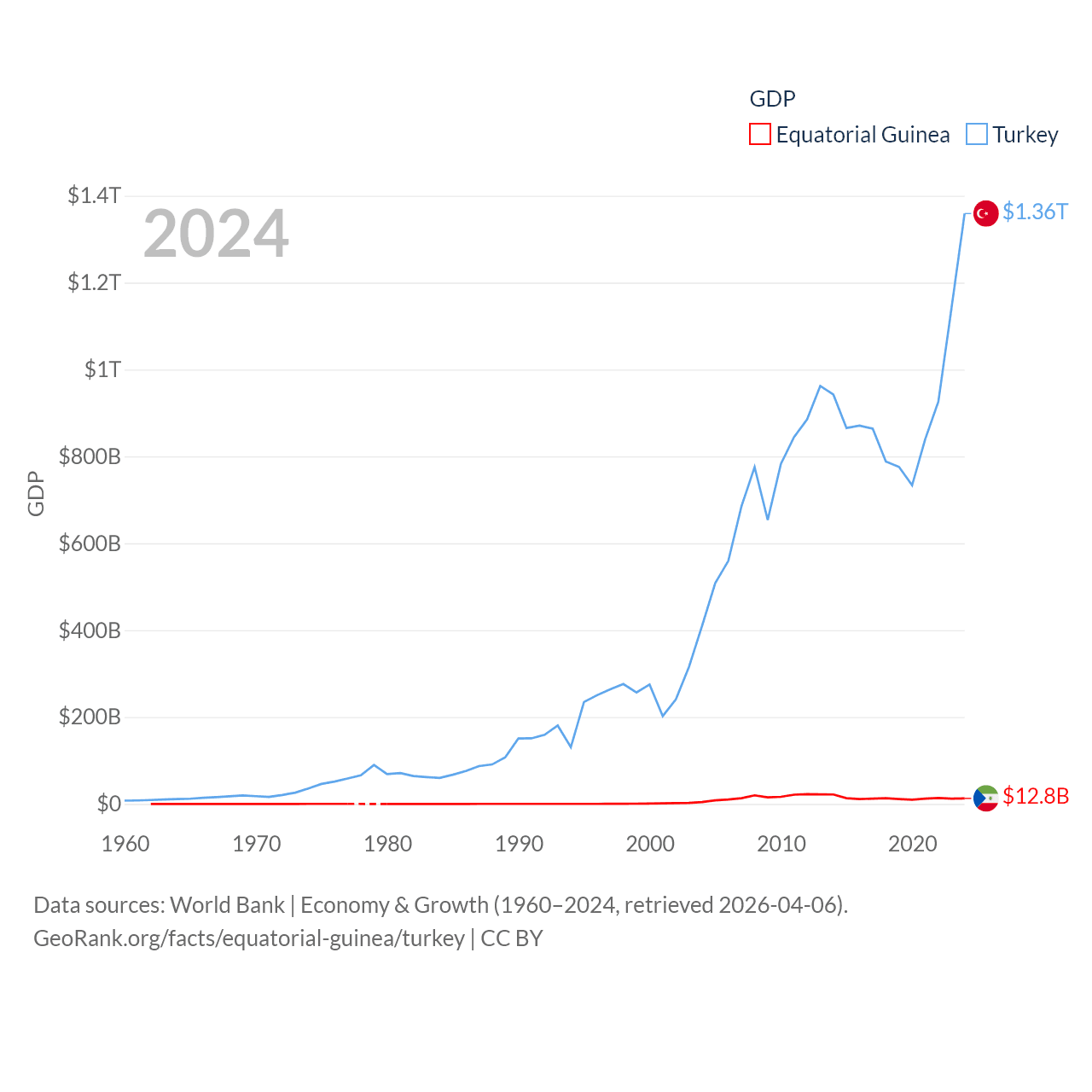 By GDP, Equatorial Guinea ranks 148/197 ($12.8B) and Turkey ranks 17/197 ($1.36T). By GDP per capita, Equatorial Guinea ranks 106/197 ($6,745), while Turkey ranks 66/197 ($15,893).