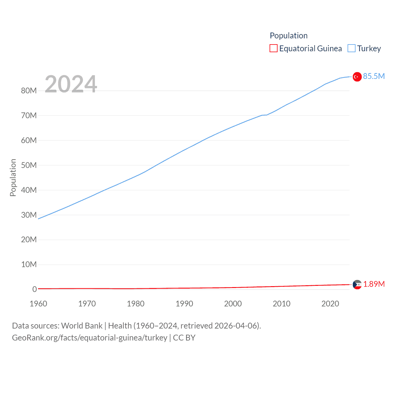 Equatorial Guinea has a population of 1.89M (ranked 148/197), compared with 85.5M in Turkey (ranked 18/197). Equatorial Guinea's land area is 10,830 sq mi versus 297,156 sq mi for Turkey (ranked 140th vs. 36th).
