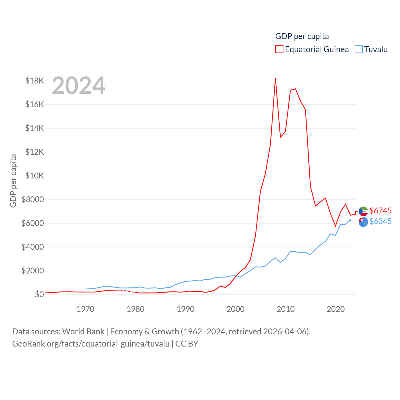By GDP, Equatorial Guinea ranks 148/197 ($12.8B) and Tuvalu ranks 196/197 ($62.3M). By GDP per capita, Equatorial Guinea ranks 106/197 ($6,745), while Tuvalu ranks 110/197 ($6,345).