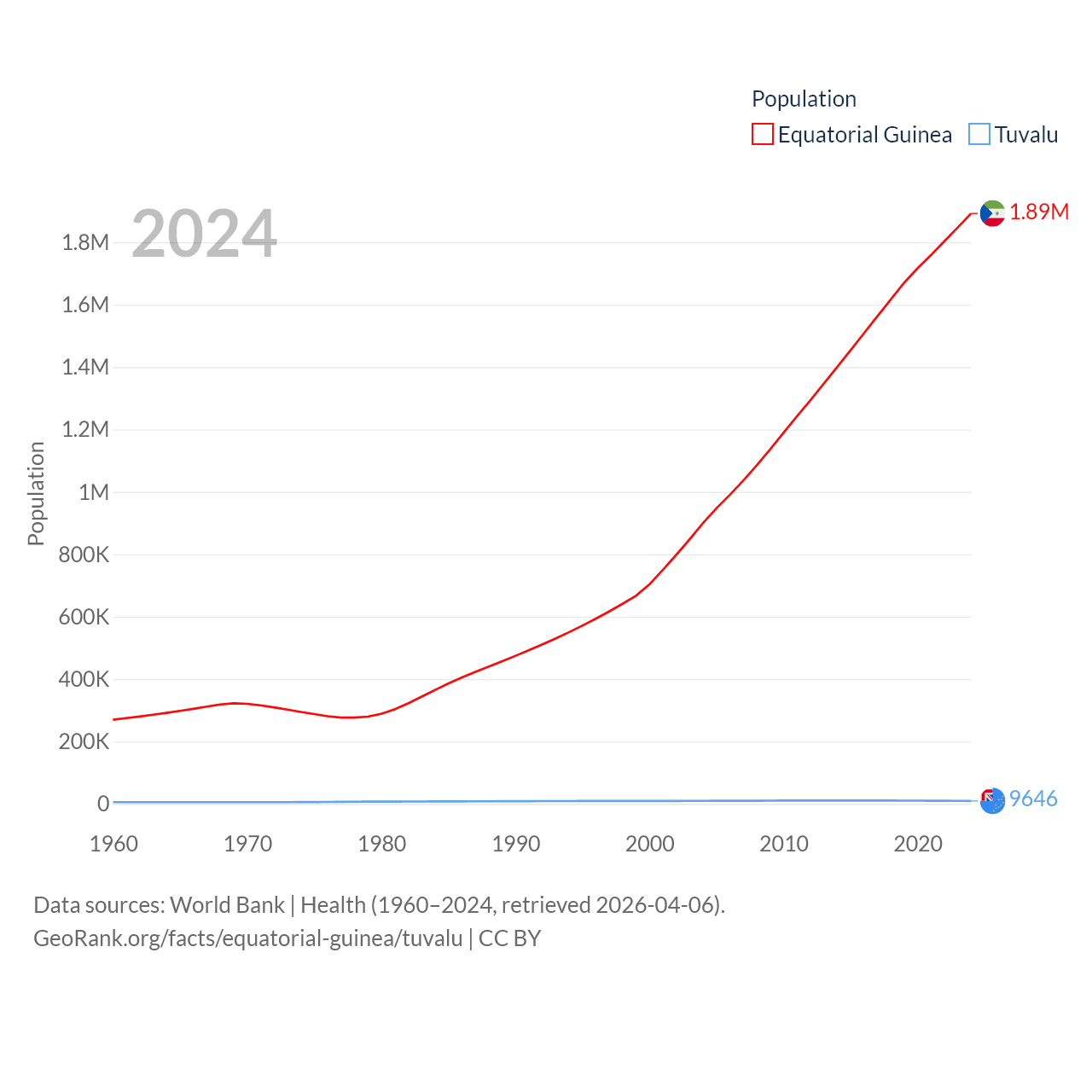 Equatorial Guinea has a population of 1.89M (ranked 148/197), compared with 9.65K in Tuvalu (ranked 196/197). Equatorial Guinea's land area is 10,830 sq mi versus 11.6 sq mi for Tuvalu (ranked 140th vs. 194th).