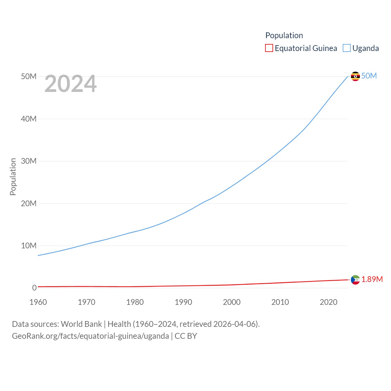 Equatorial Guinea has a population of 1.89M (ranked 148/197), compared with 50M in Uganda (ranked 31/197). Equatorial Guinea's land area is 10,830 sq mi versus 77,421 sq mi for Uganda (ranked 140th vs. 84th).