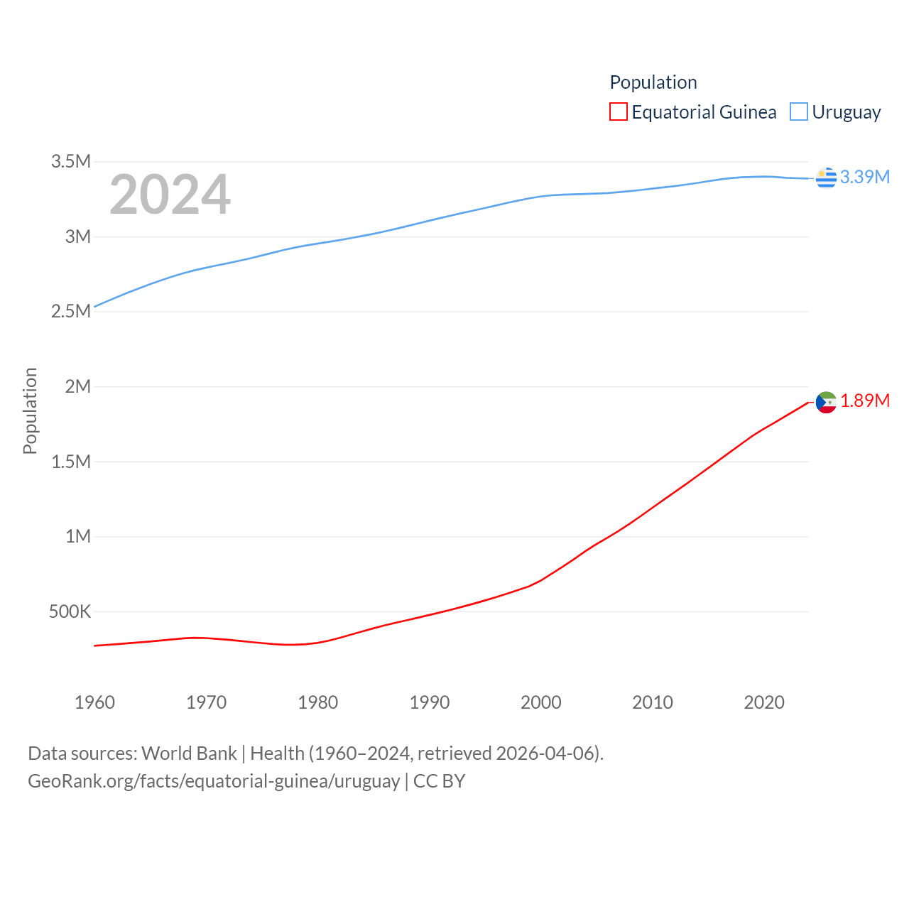 Equatorial Guinea has a population of 1.89M (ranked 148/197), compared with 3.39M in Uruguay (ranked 133/197). Equatorial Guinea's land area is 10,830 sq mi versus 67,576 sq mi for Uruguay (ranked 140th vs. 89th).