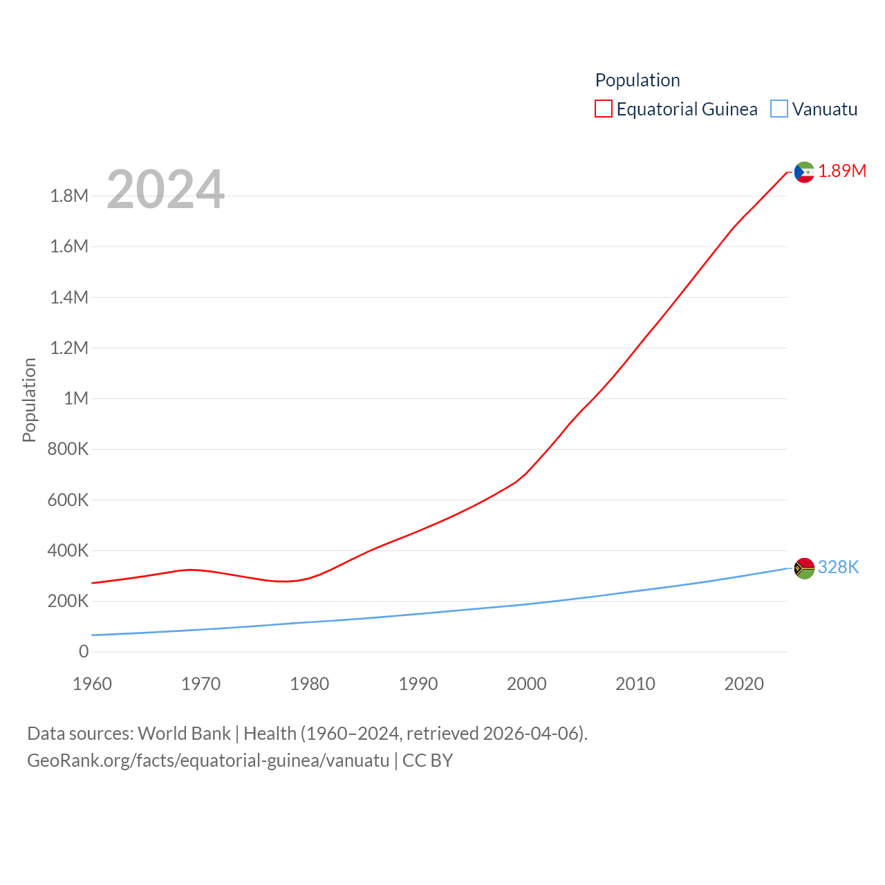 Equatorial Guinea has a population of 1.89M (ranked 148/197), compared with 328K in Vanuatu (ranked 174/197). Equatorial Guinea's land area is 10,830 sq mi versus 4,707 sq mi for Vanuatu (ranked 140th vs. 157th).