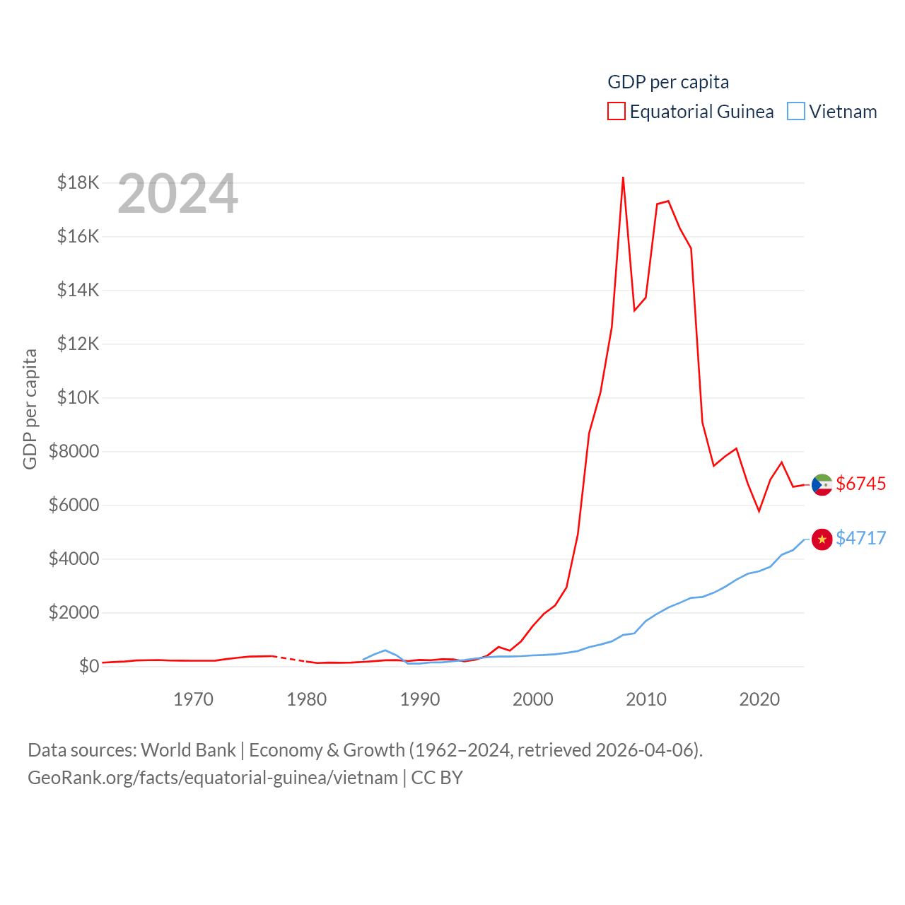 By GDP, Equatorial Guinea ranks 148/197 ($12.8B) and Vietnam ranks 33/197 ($476B). By GDP per capita, Equatorial Guinea ranks 106/197 ($6,745), while Vietnam ranks 122/197 ($4,717).