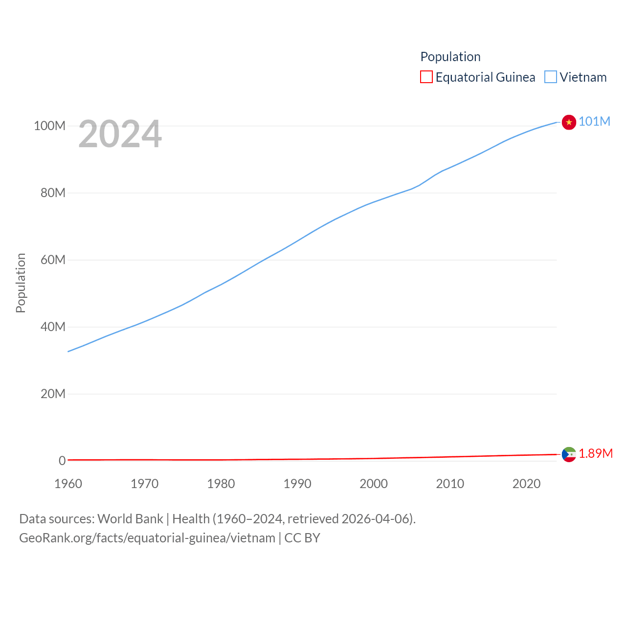 Equatorial Guinea has a population of 1.89M (ranked 148/197), compared with 101M in Vietnam (ranked 16/197). Equatorial Guinea's land area is 10,830 sq mi versus 121,016 sq mi for Vietnam (ranked 140th vs. 67th).
