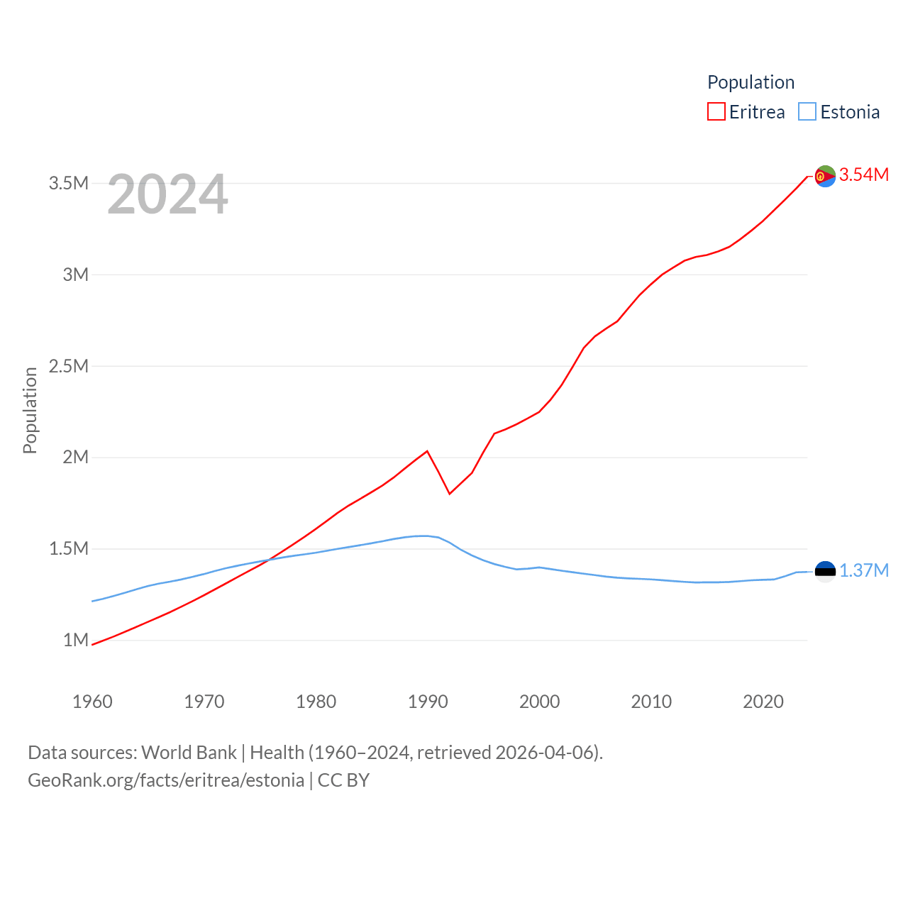 Eritrea has a population of 3.54M (ranked 131/197), compared with 1.37M in Estonia (ranked 153/197). Eritrea's land area is 46,787 sq mi versus 16,498 sq mi for Estonia (ranked 96th vs. 129th).