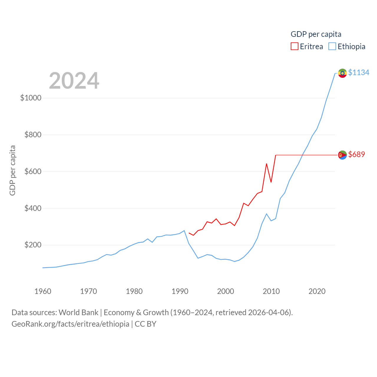 By GDP, Eritrea ranks 179/197 ($2.07B) and Ethiopia ranks 60/197 ($150B). By GDP per capita, Eritrea ranks 188/197 ($689), while Ethiopia ranks 171/197 ($1,134).
