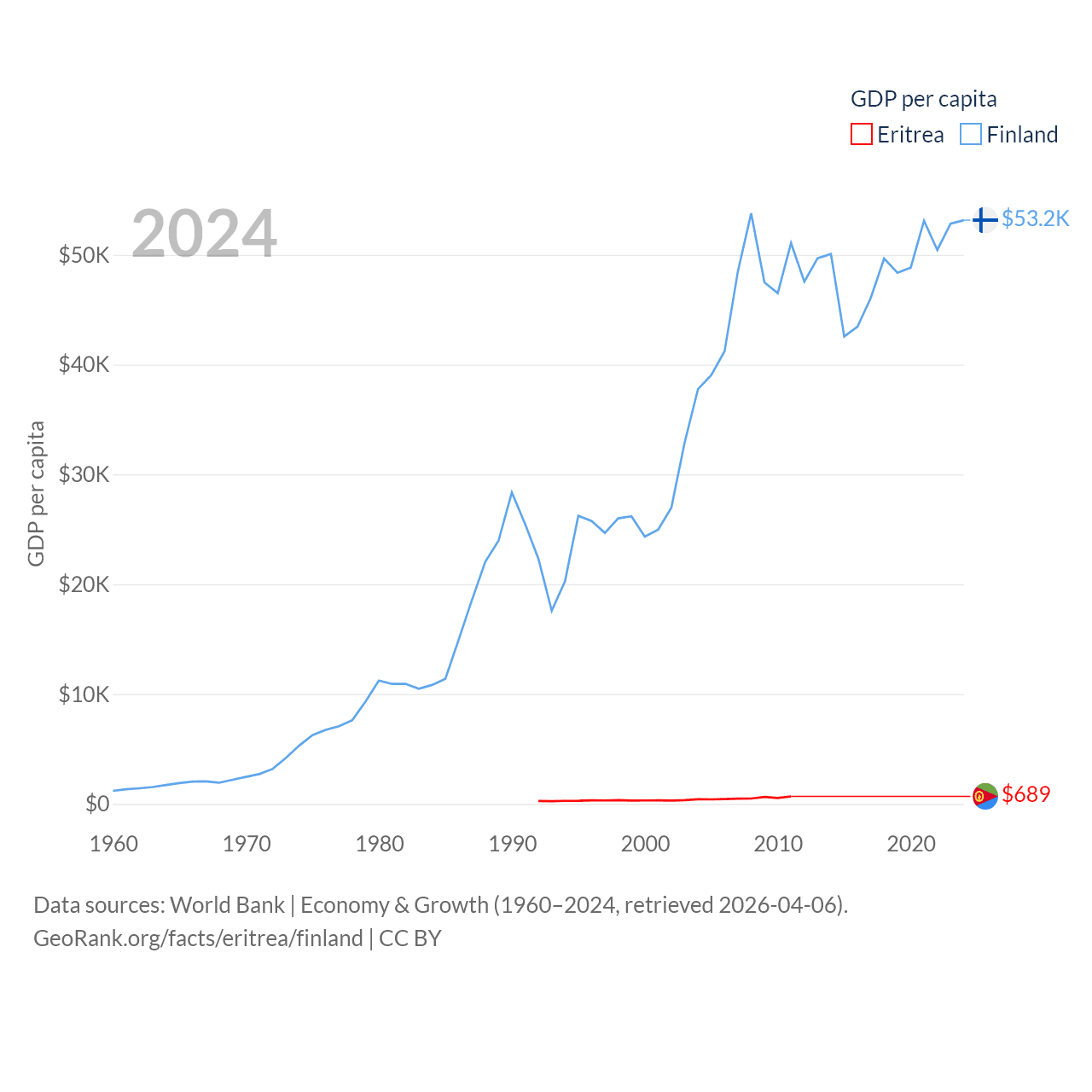 By GDP, Eritrea ranks 179/197 ($2.07B) and Finland ranks 47/197 ($299B). By GDP per capita, Eritrea ranks 188/197 ($689), while Finland ranks 23/197 ($53,150).