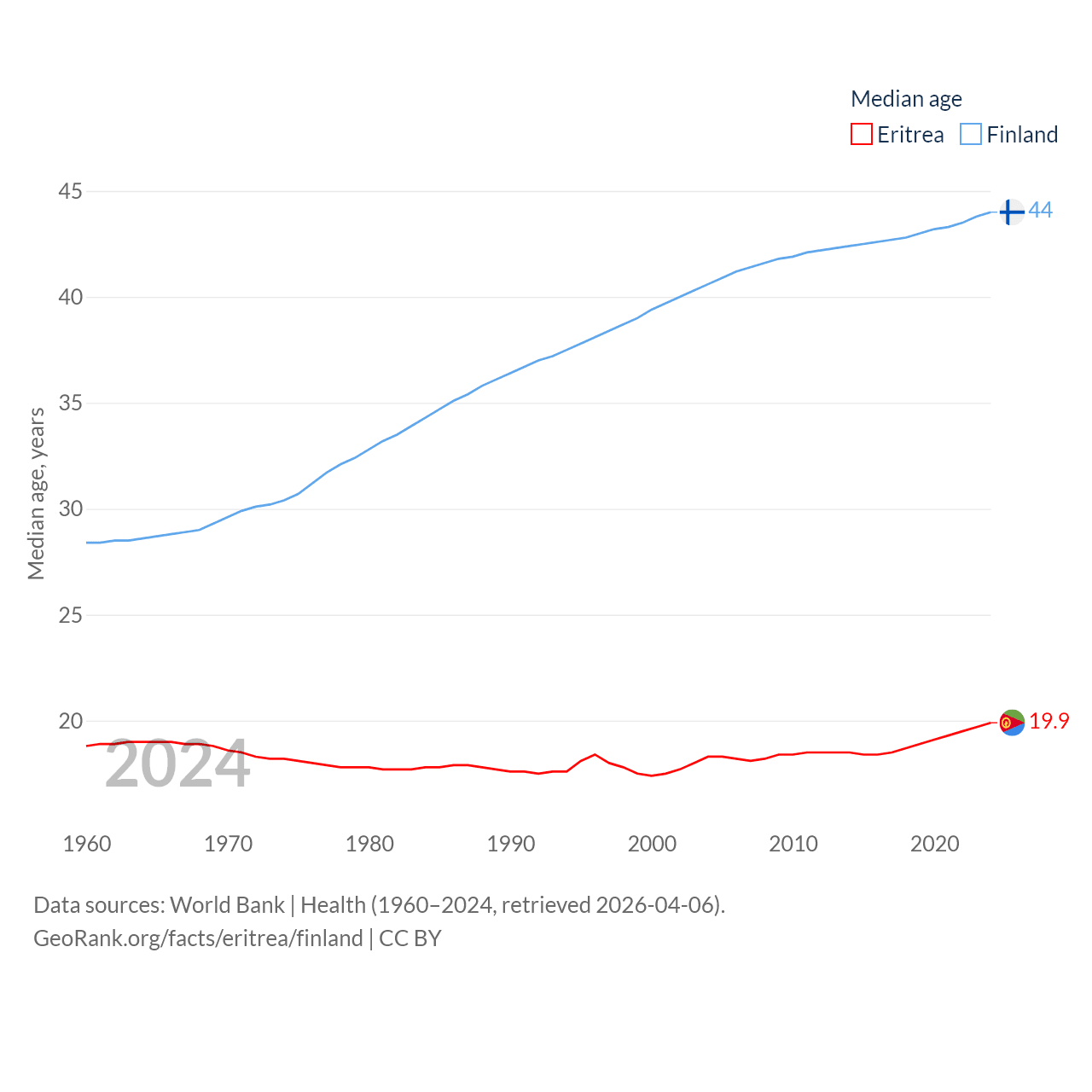Eritrea has a population of 3.54M (ranked 131/197), compared with 5.62M in Finland (ranked 116/197). Eritrea's land area is 46,787 sq mi versus 117,360 sq mi for Finland (ranked 96th vs. 70th).