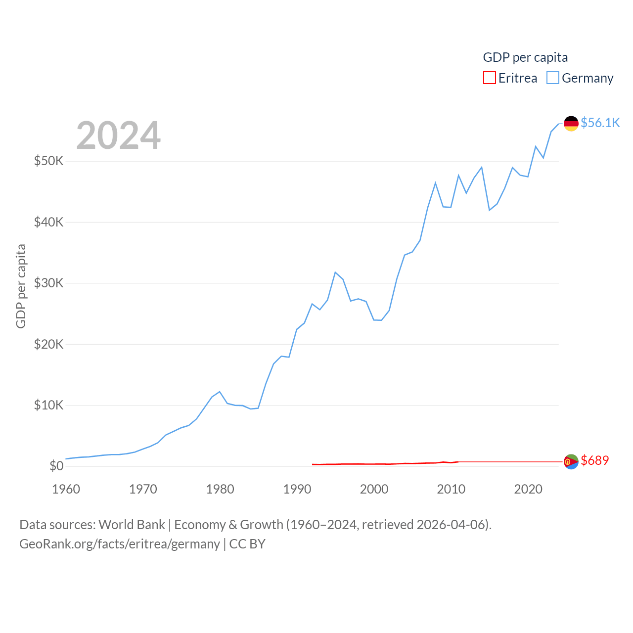 By GDP, Eritrea ranks 179/197 ($2.07B) and Germany ranks 3/197 ($4.69T). By GDP per capita, Eritrea ranks 188/197 ($689), while Germany ranks 19/197 ($56,104).