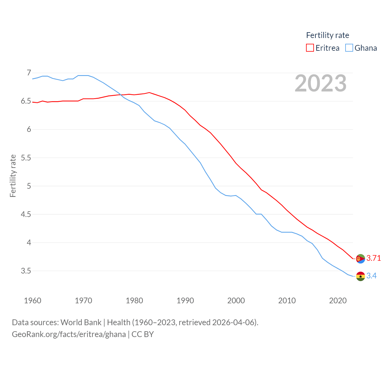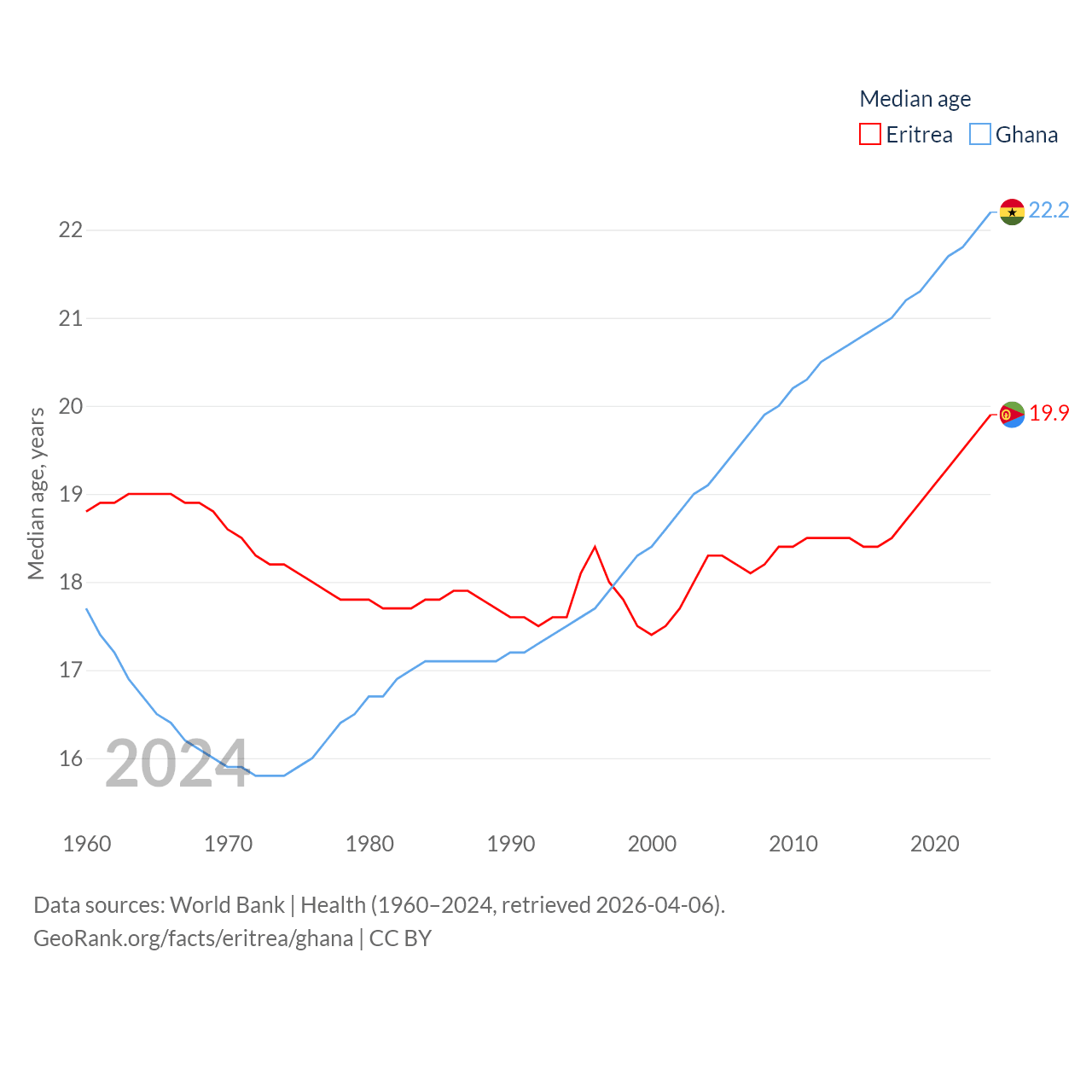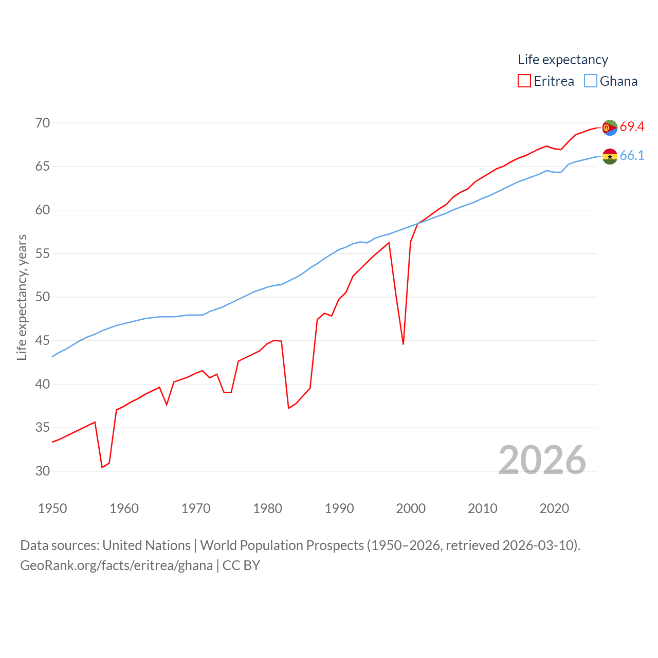 Eritrea has a population of 3.54M (ranked 131/197), compared with 34.4M in Ghana (ranked 47/197). Eritrea's land area is 46,787 sq mi versus 87,851 sq mi for Ghana (ranked 96th vs. 81st).
