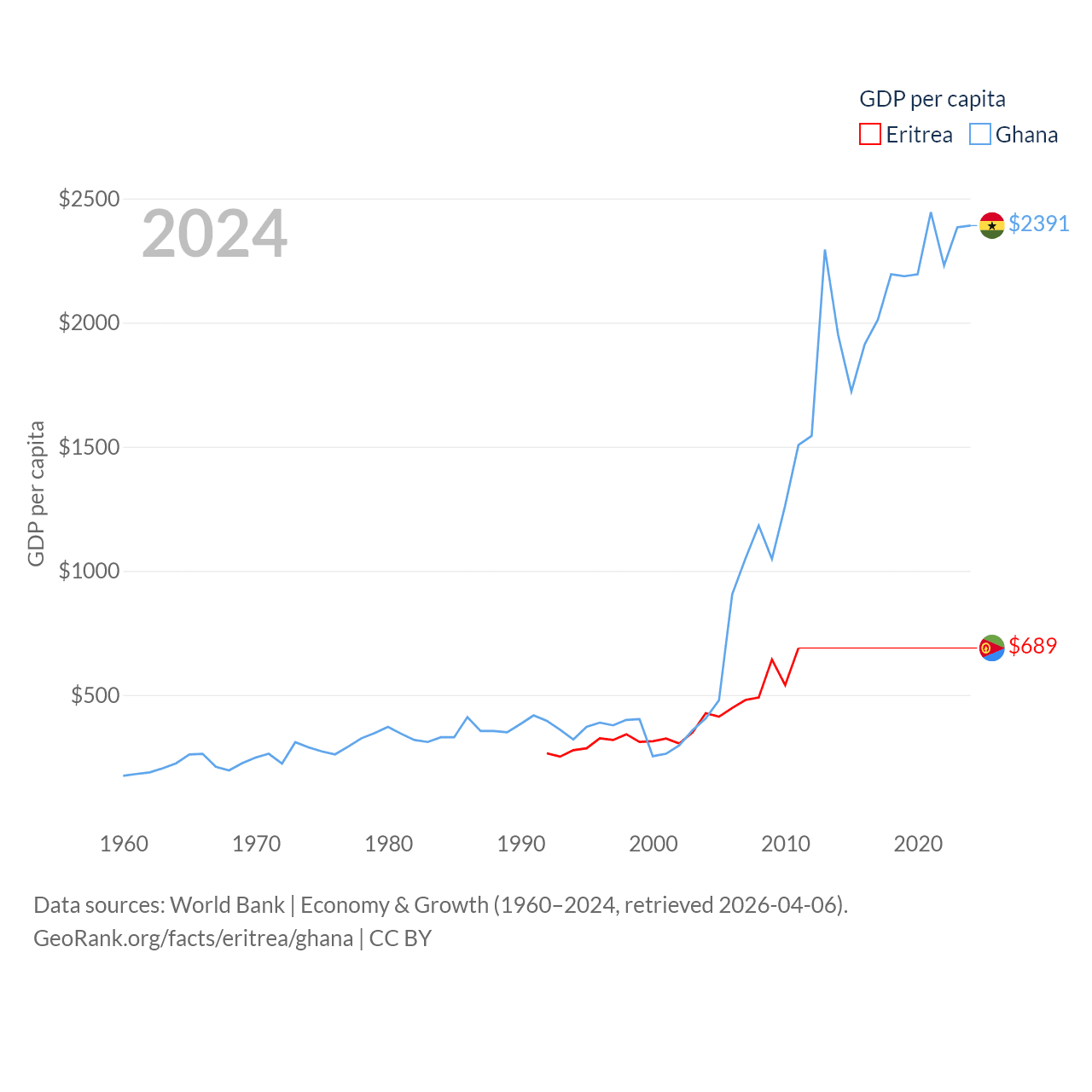 By GDP, Eritrea ranks 179/197 ($2.07B) and Ghana ranks 80/197 ($82.3B). By GDP per capita, Eritrea ranks 188/197 ($689), while Ghana ranks 151/197 ($2,391).