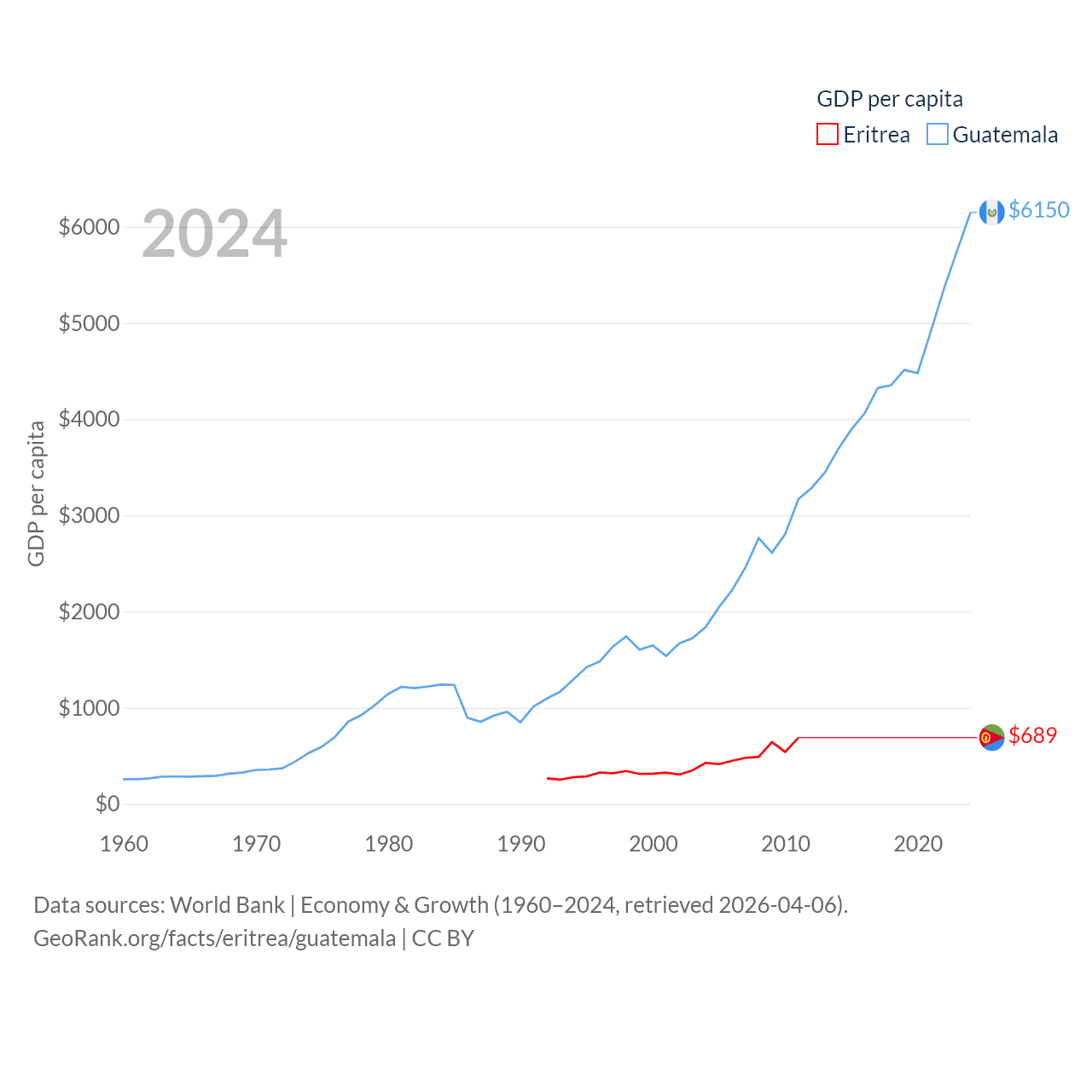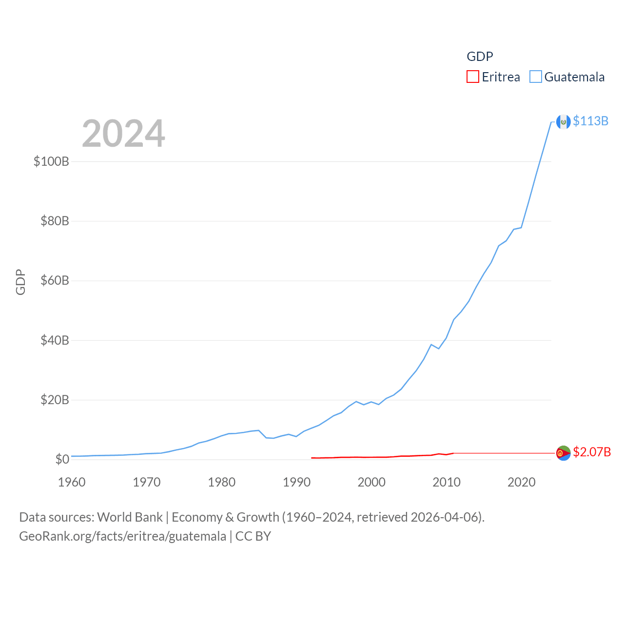 By GDP, Eritrea ranks 179/197 ($2.07B) and Guatemala ranks 68/197 ($113B). By GDP per capita, Eritrea ranks 188/197 ($689), while Guatemala ranks 112/197 ($6,150).