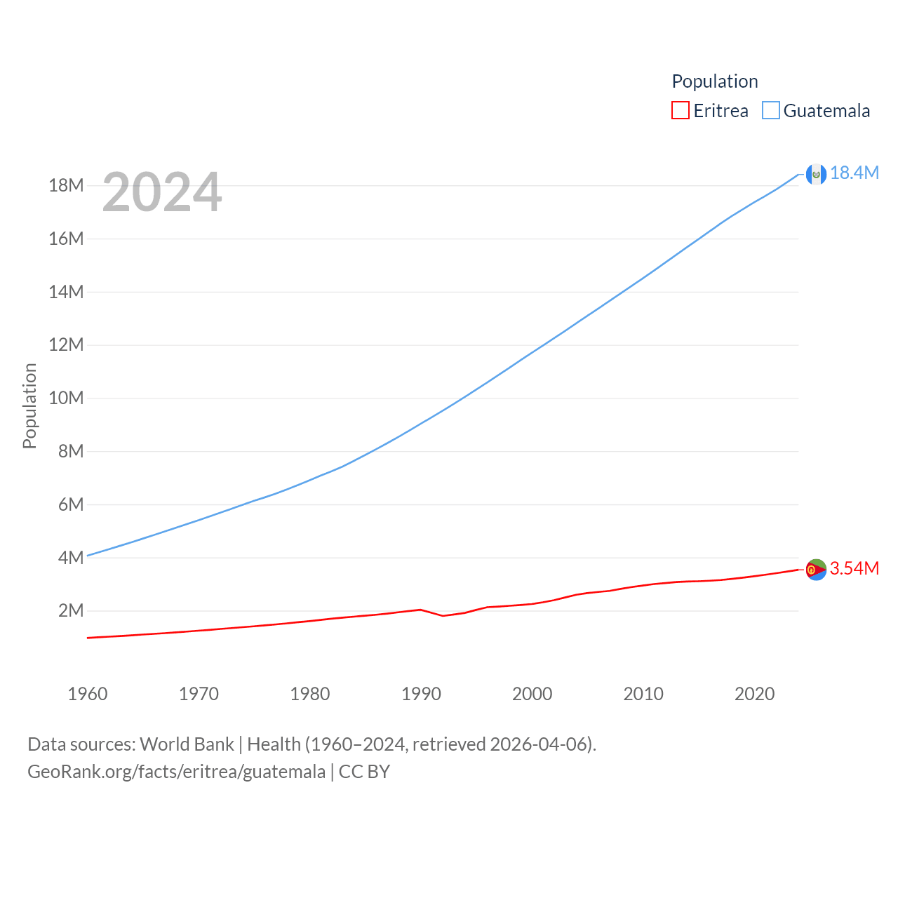Eritrea has a population of 3.54M (ranked 131/197), compared with 18.4M in Guatemala (ranked 70/197). Eritrea's land area is 46,787 sq mi versus 41,375 sq mi for Guatemala (ranked 96th vs. 102nd).
