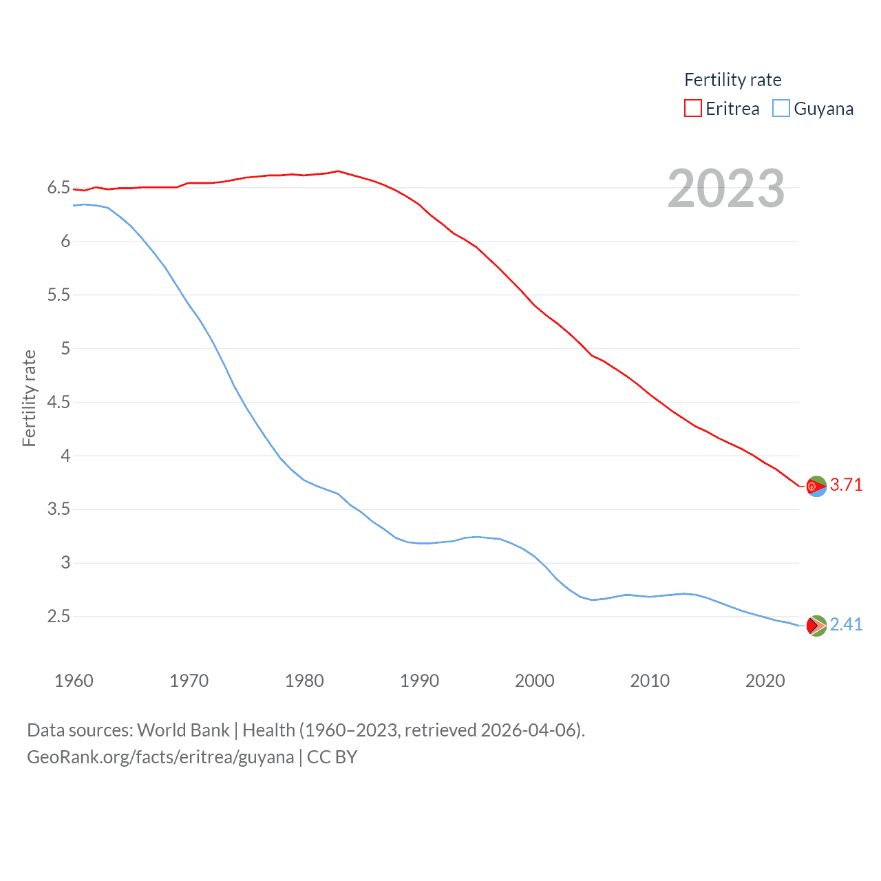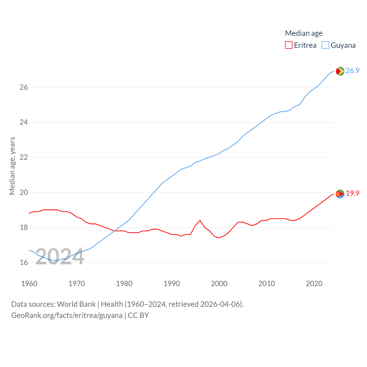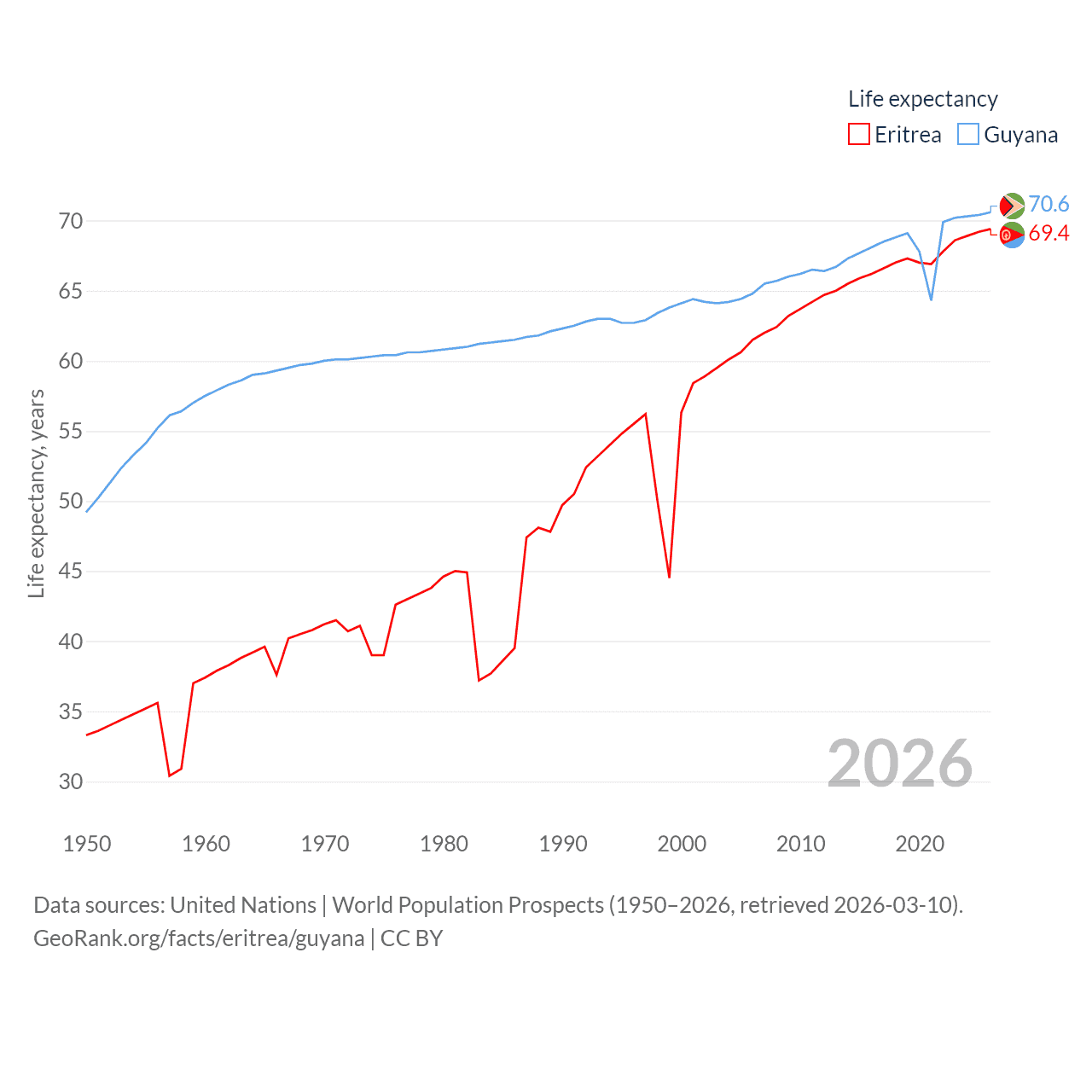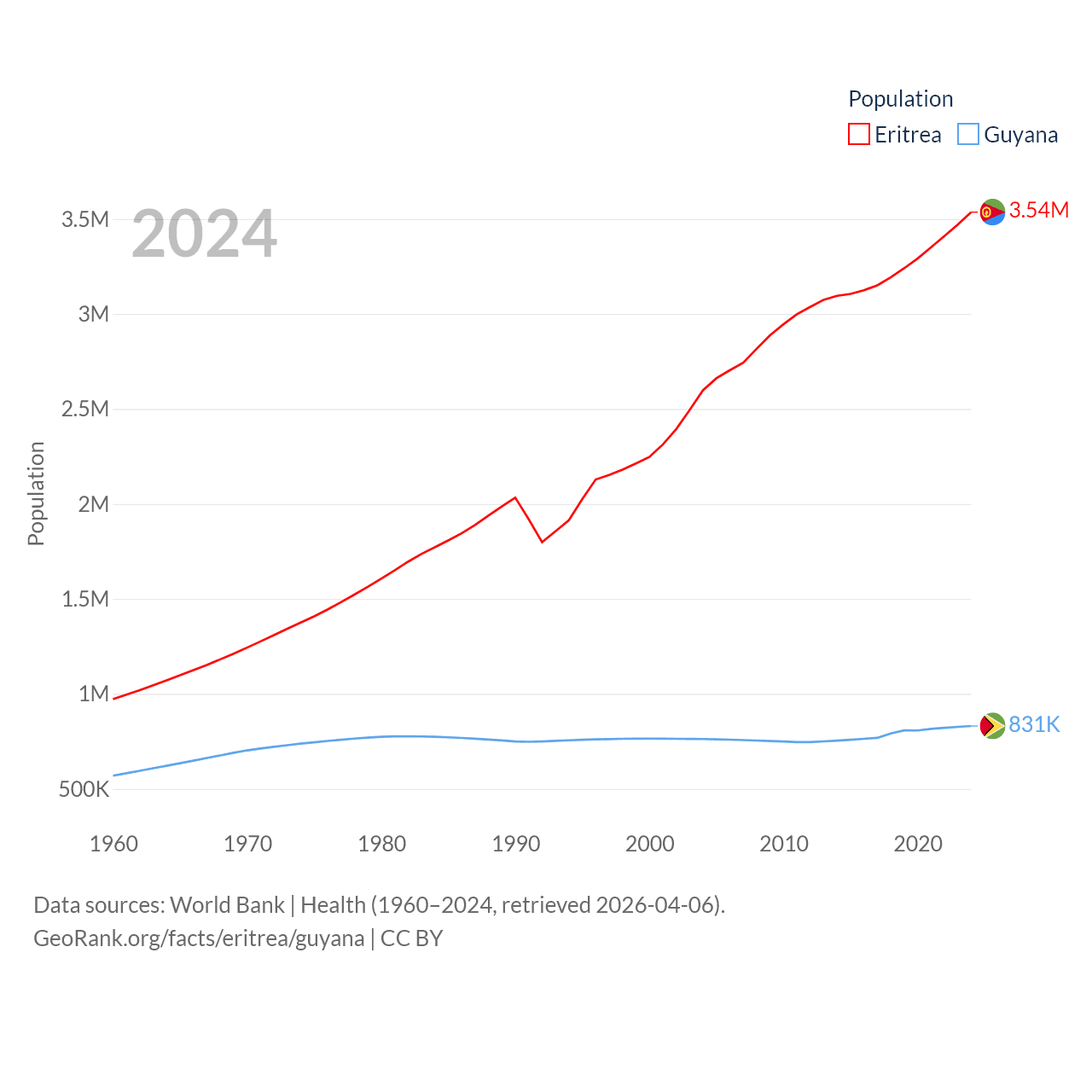 Eritrea has a population of 3.54M (ranked 131/197), compared with 831K in Guyana (ranked 161/197). Eritrea's land area is 46,787 sq mi versus 81,522 sq mi for Guyana (ranked 96th vs. 82nd).