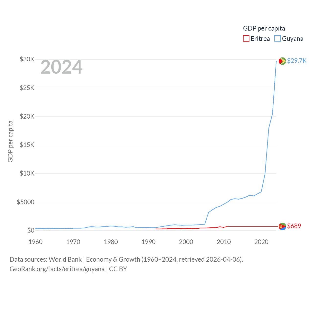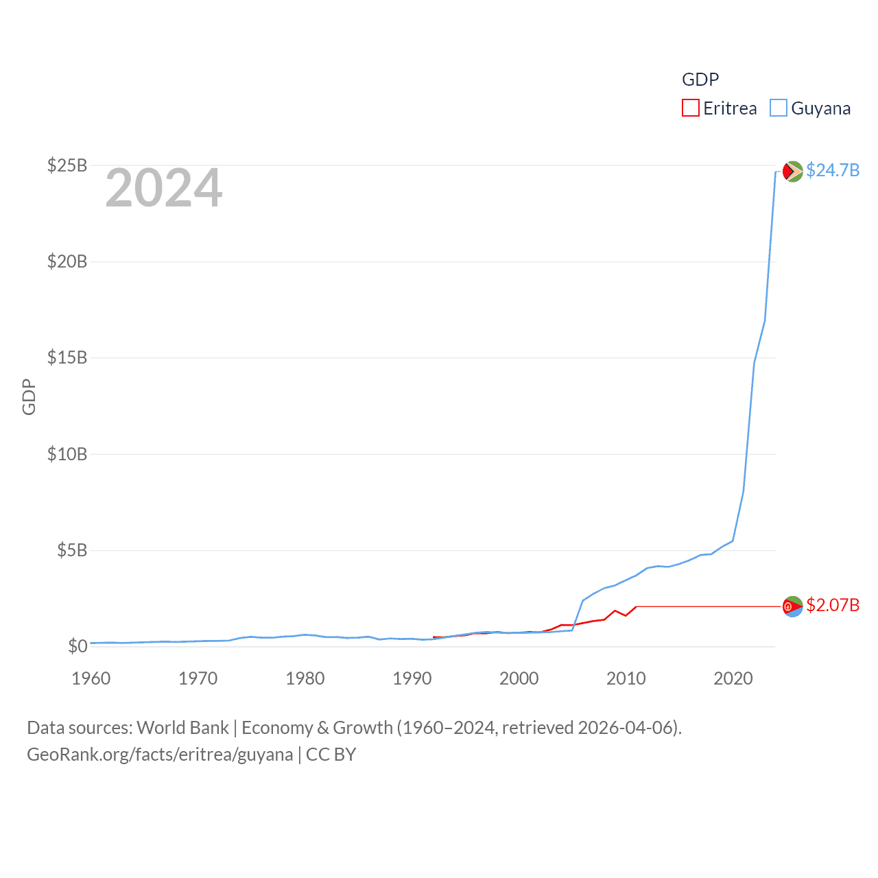By GDP, Eritrea ranks 179/197 ($2.07B) and Guyana ranks 120/197 ($24.7B). By GDP per capita, Eritrea ranks 188/197 ($689), while Guyana ranks 41/197 ($29,675).