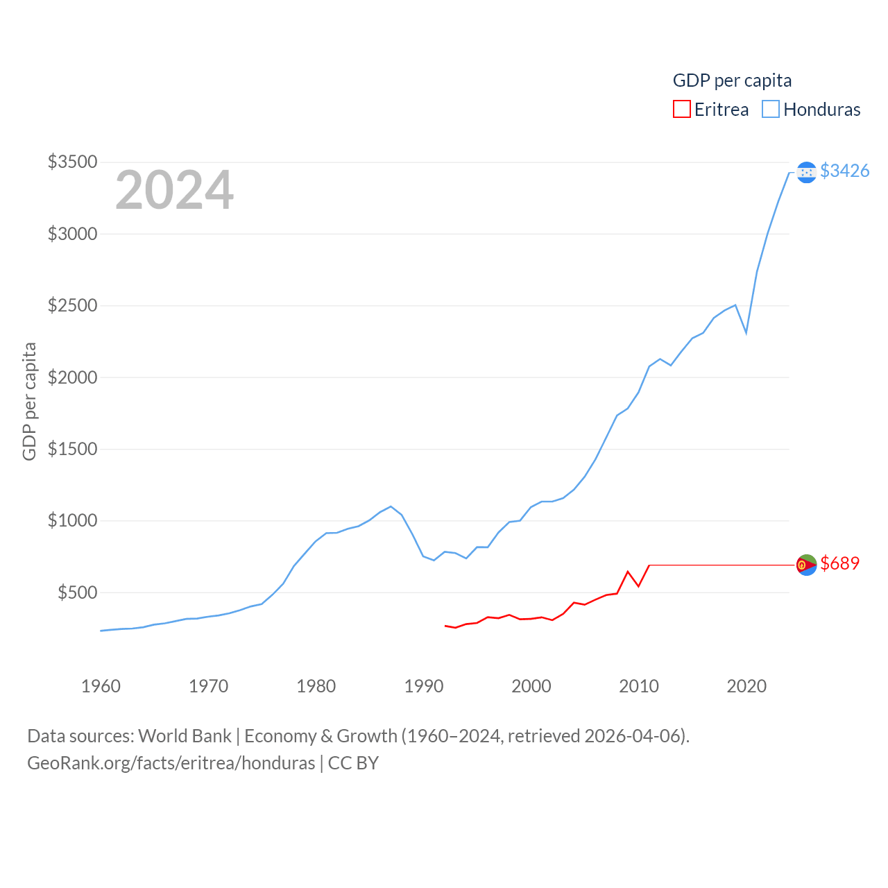 By GDP, Eritrea ranks 179/197 ($2.07B) and Honduras ranks 104/197 ($37.1B). By GDP per capita, Eritrea ranks 188/197 ($689), while Honduras ranks 136/197 ($3,426).