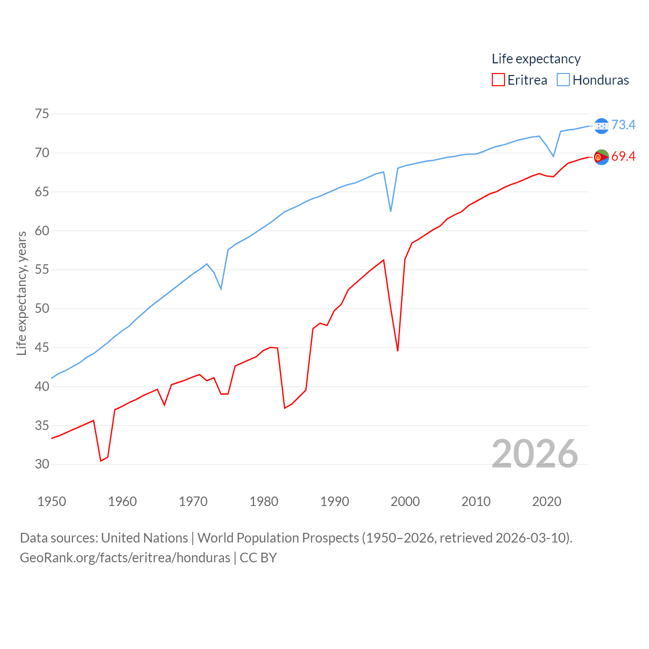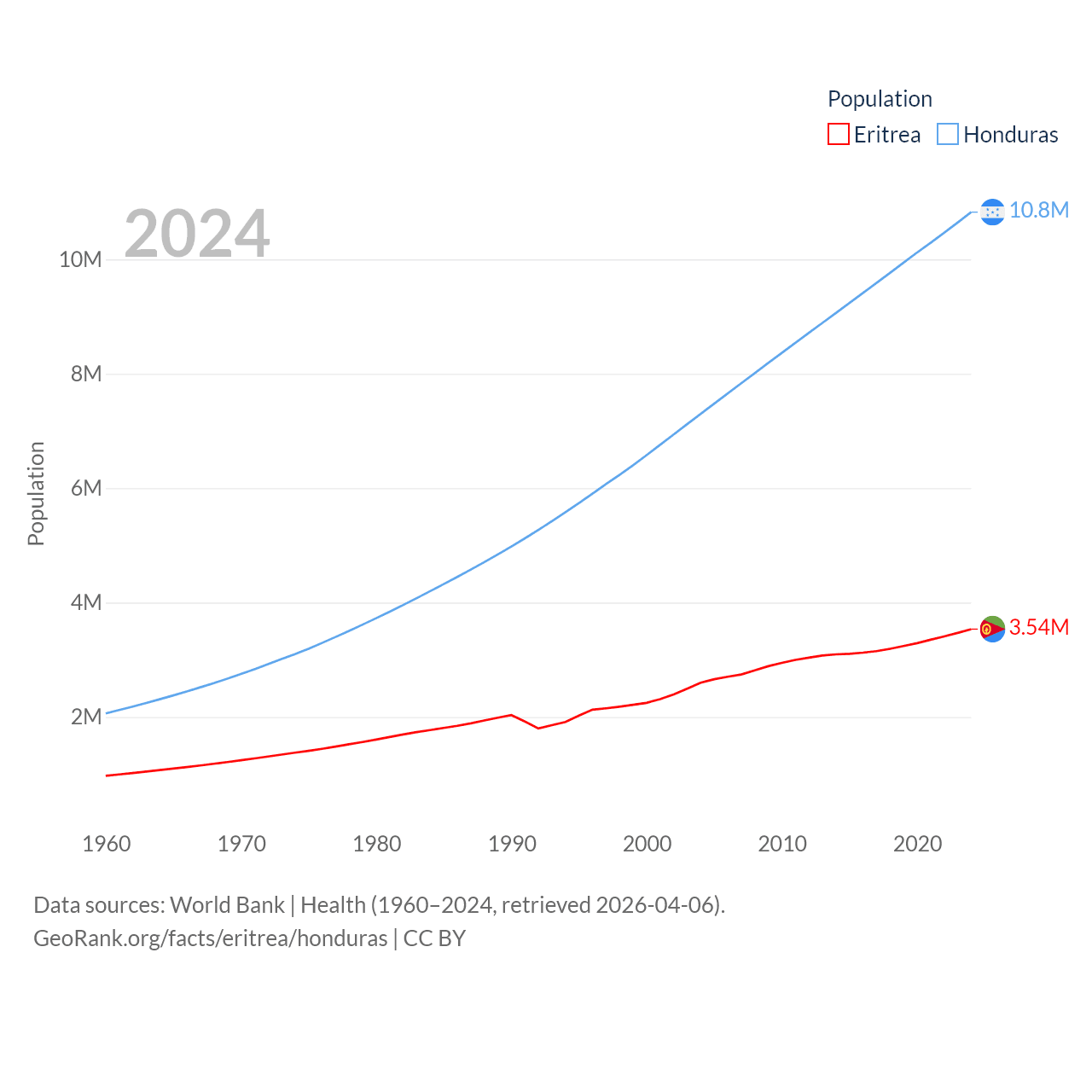 Eritrea has a population of 3.54M (ranked 131/197), compared with 10.8M in Honduras (ranked 89/197). Eritrea's land area is 46,787 sq mi versus 43,201 sq mi for Honduras (ranked 96th vs. 100th).