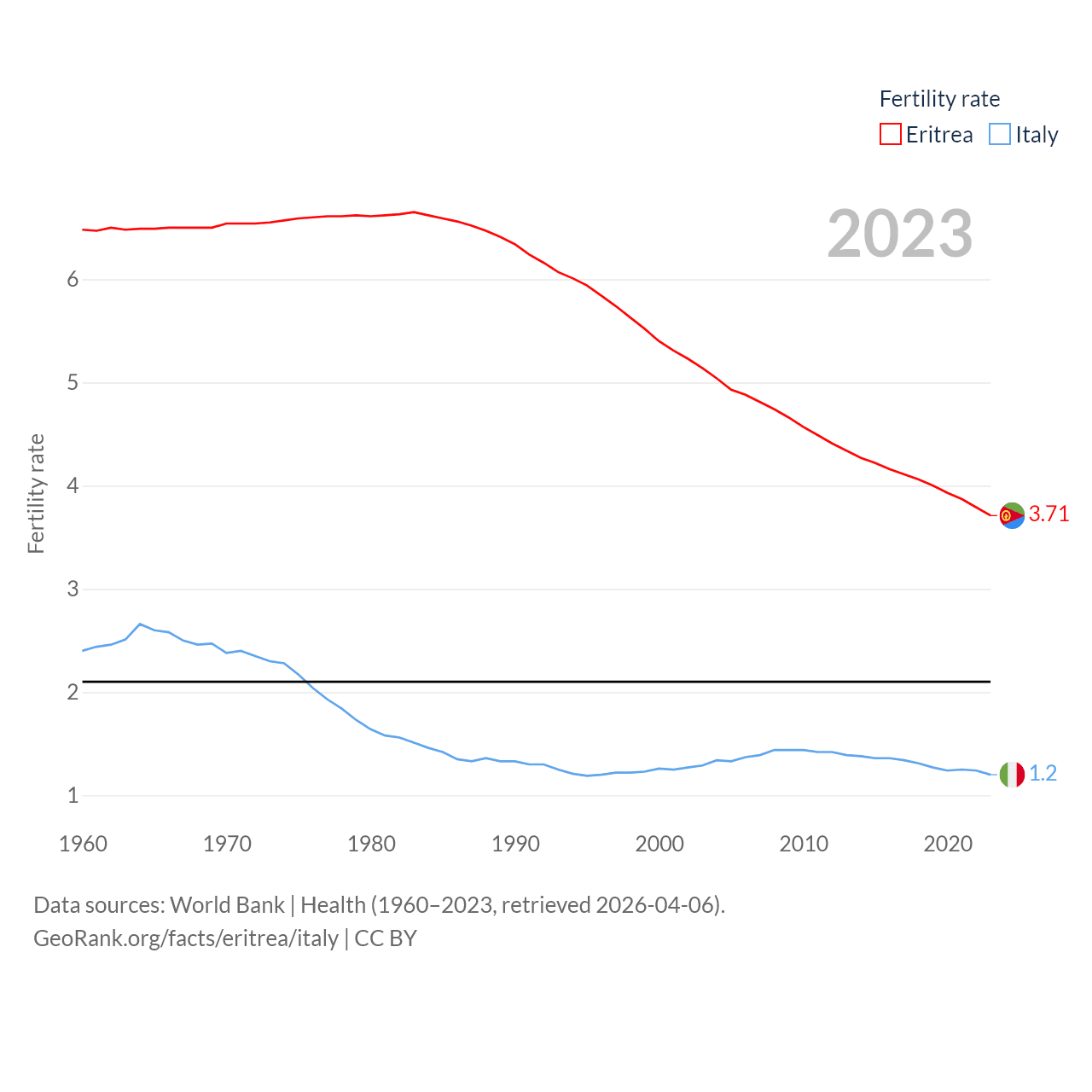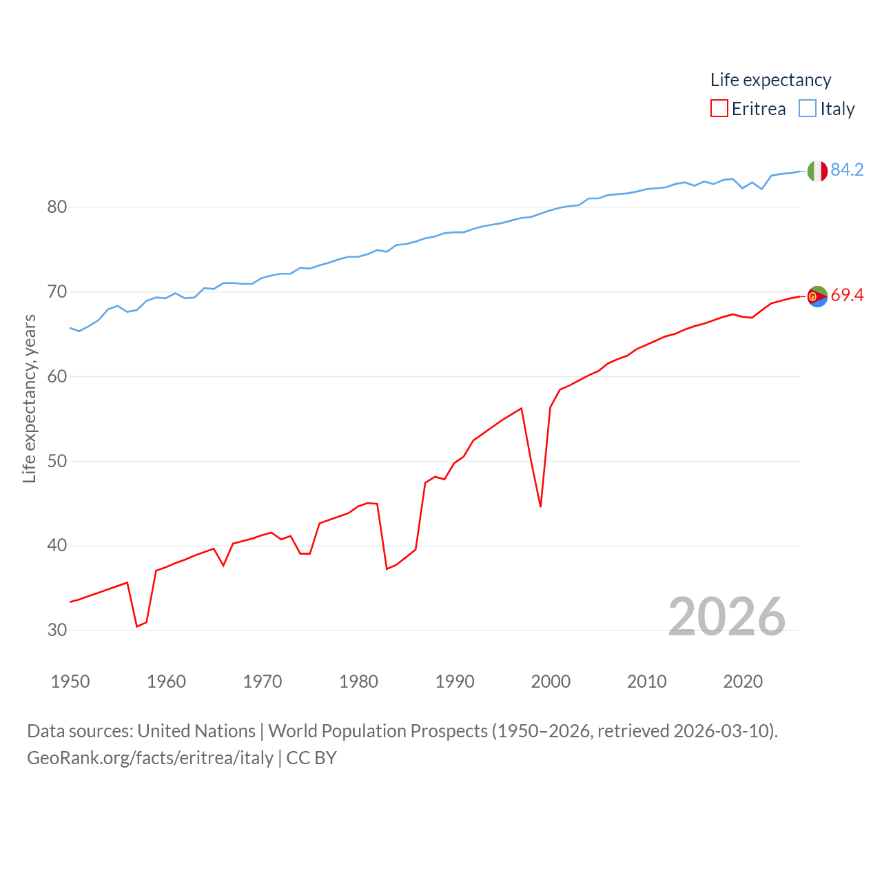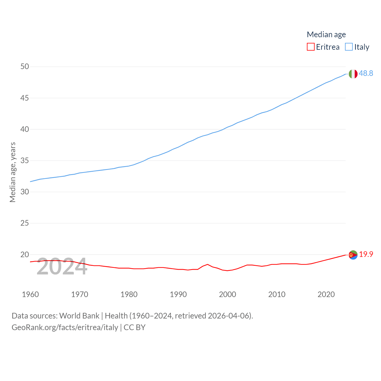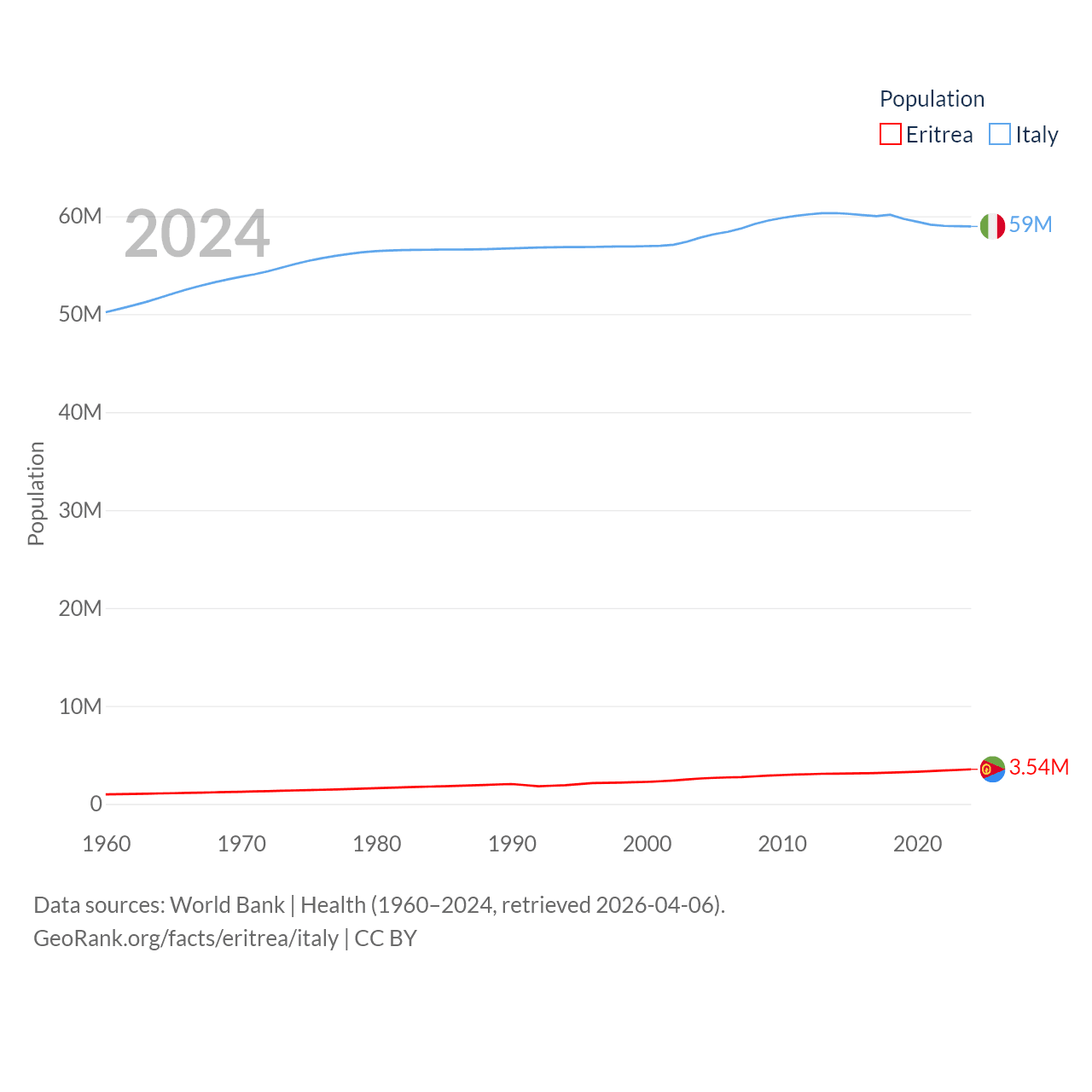 Eritrea has a population of 3.54M (ranked 131/197), compared with 59M in Italy (ranked 25/197). Eritrea's land area is 46,787 sq mi versus 114,178 sq mi for Italy (ranked 96th vs. 72nd).