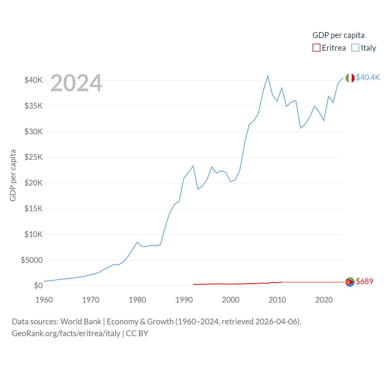 By GDP, Eritrea ranks 179/197 ($2.07B) and Italy ranks 8/197 ($2.38T). By GDP per capita, Eritrea ranks 188/197 ($689), while Italy ranks 29/197 ($40,385).