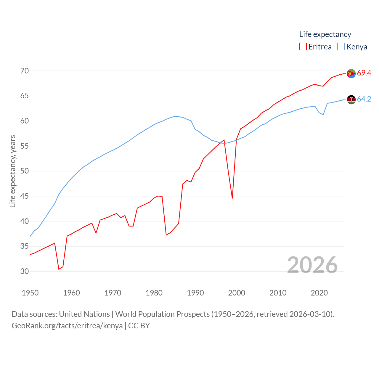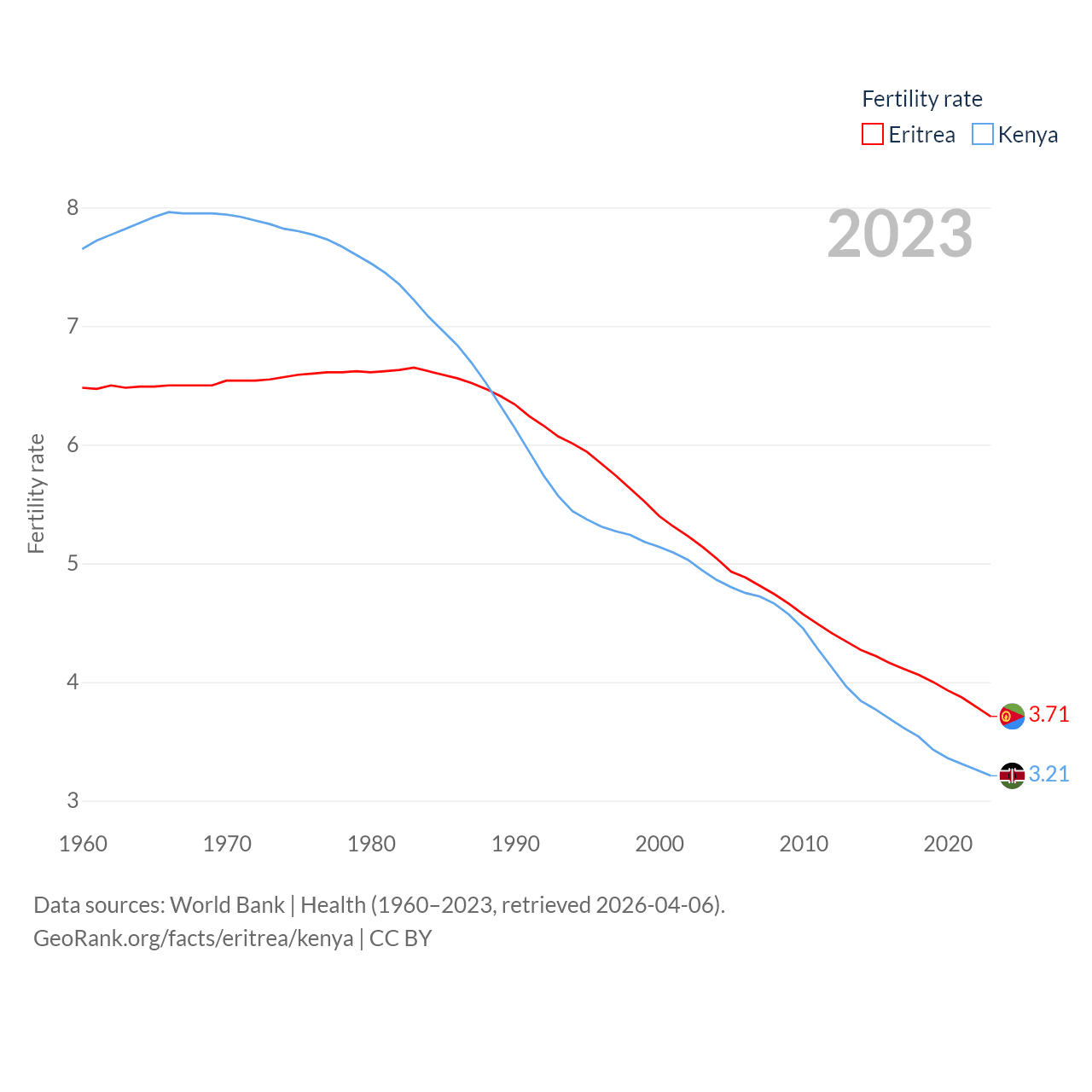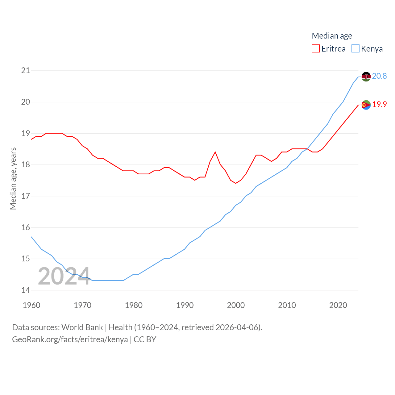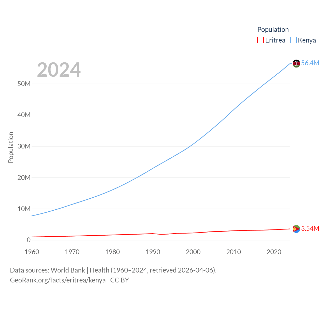 Eritrea has a population of 3.54M (ranked 131/197), compared with 56.4M in Kenya (ranked 26/197). Eritrea's land area is 46,787 sq mi versus 224,278 sq mi for Kenya (ranked 96th vs. 45th).