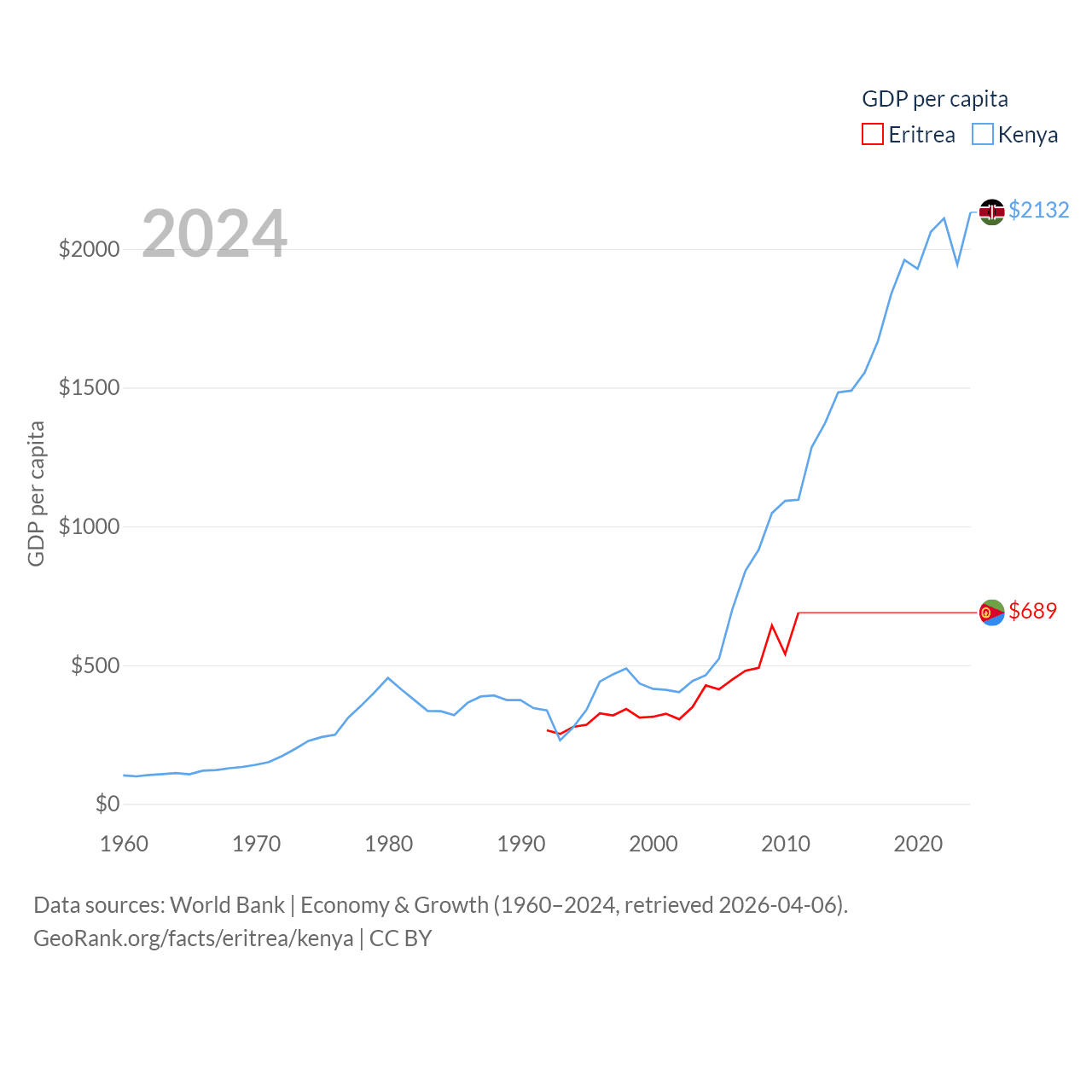 By GDP, Eritrea ranks 179/197 ($2.07B) and Kenya ranks 64/197 ($120B). By GDP per capita, Eritrea ranks 188/197 ($689), while Kenya ranks 154/197 ($2,132).