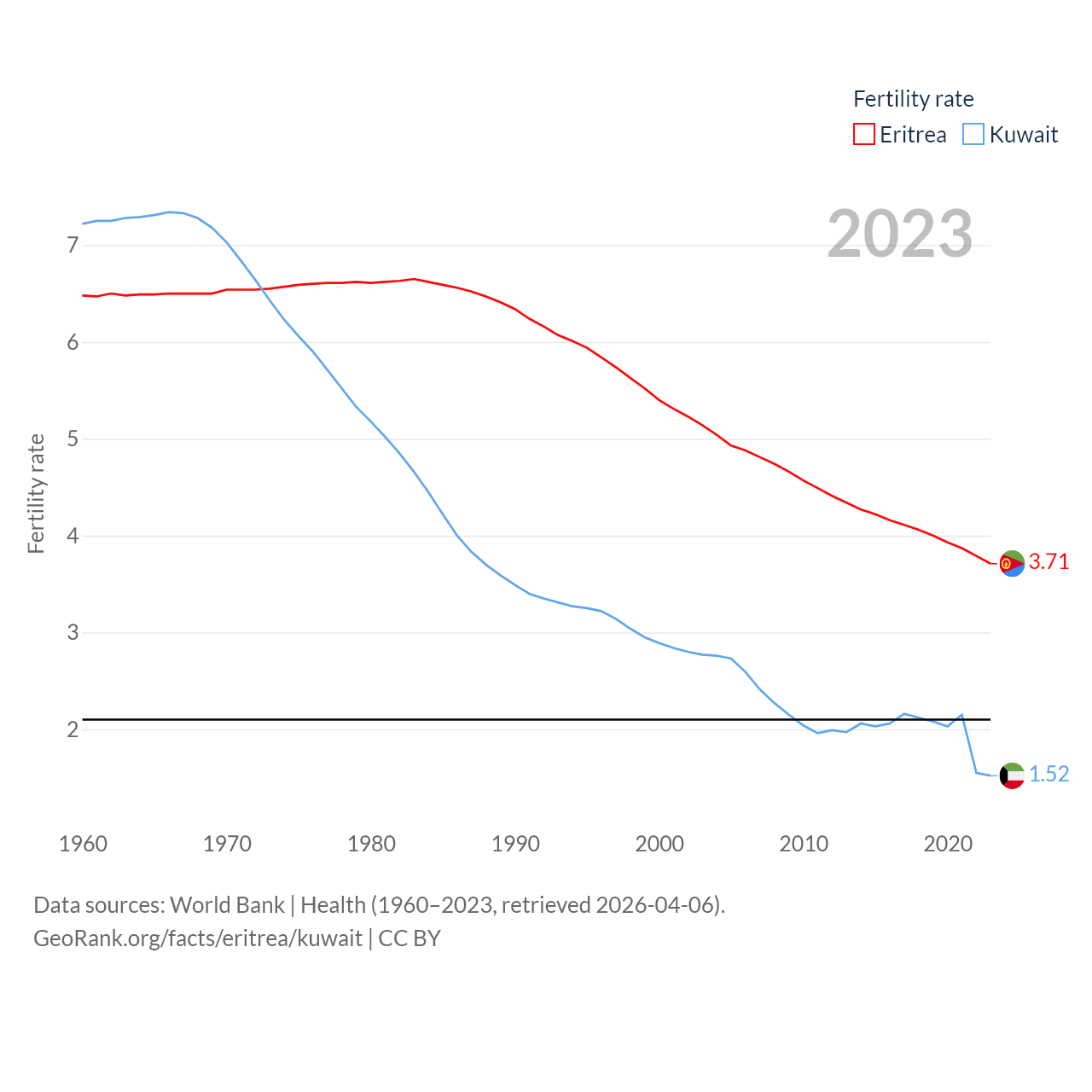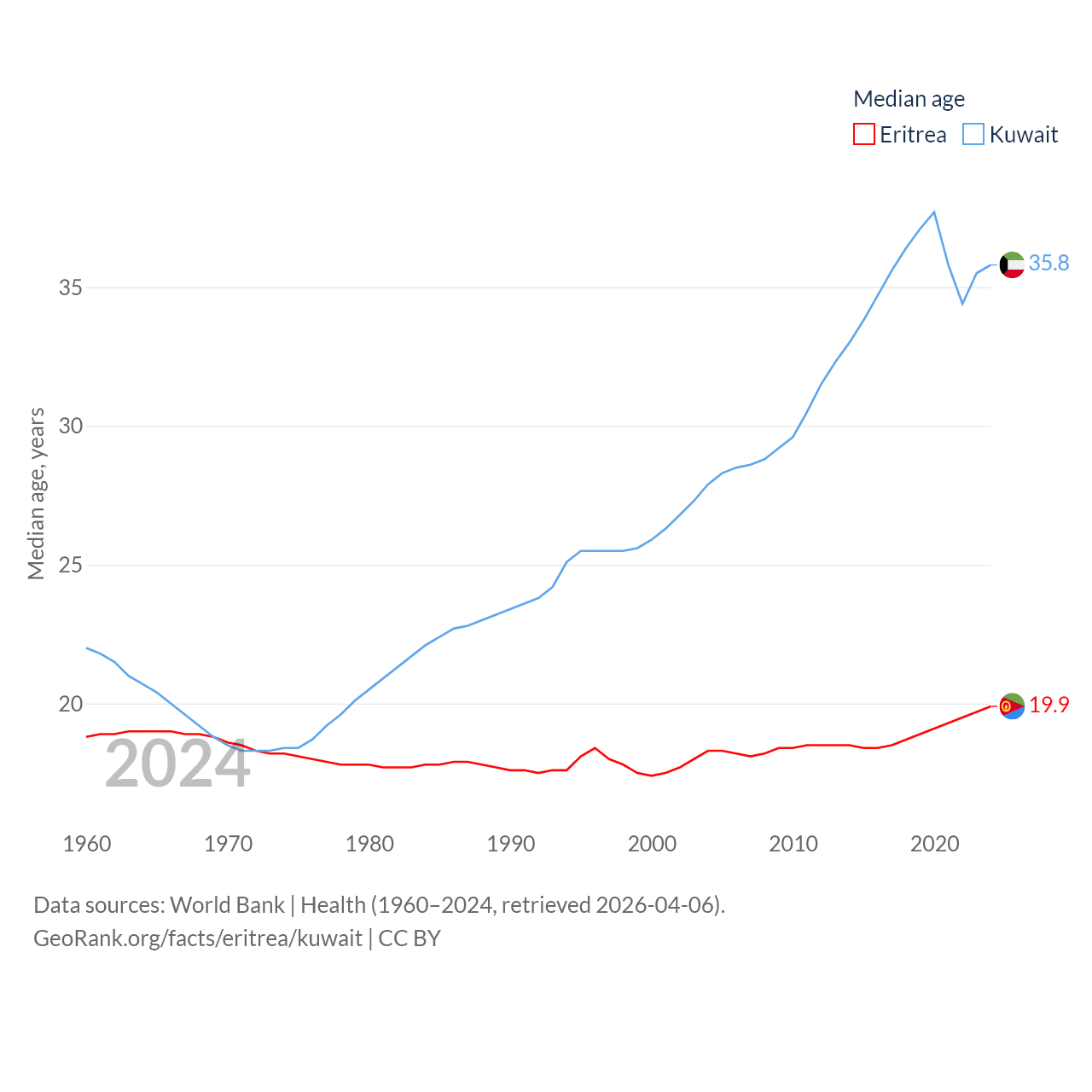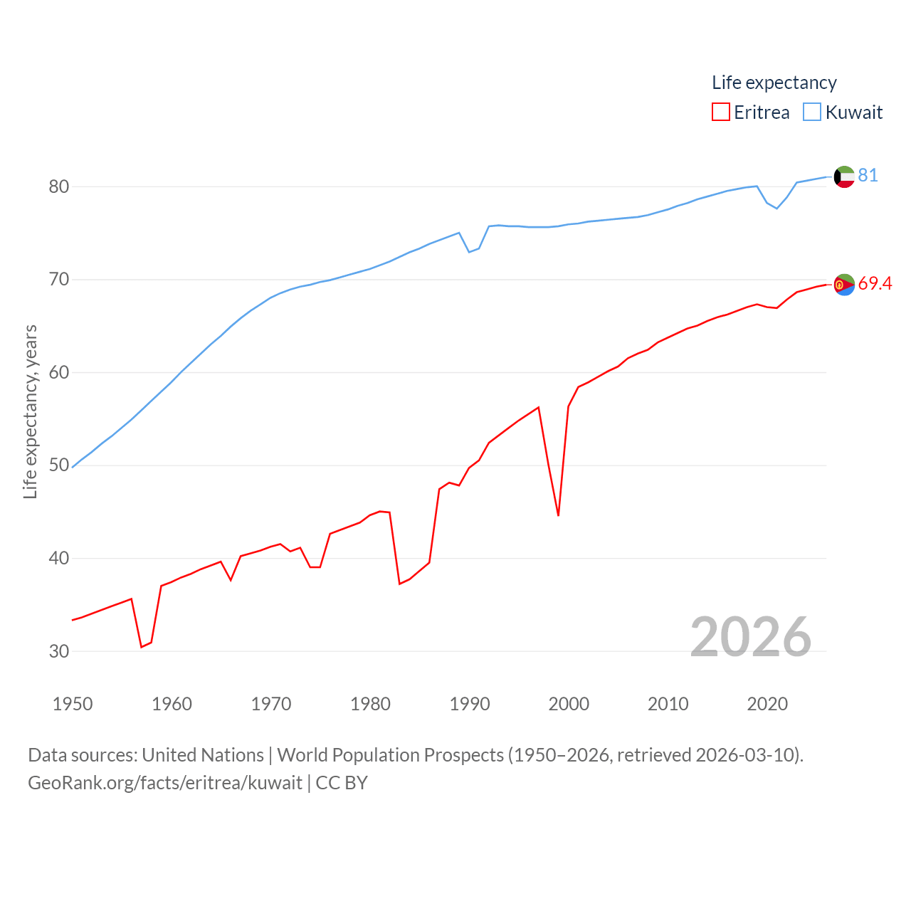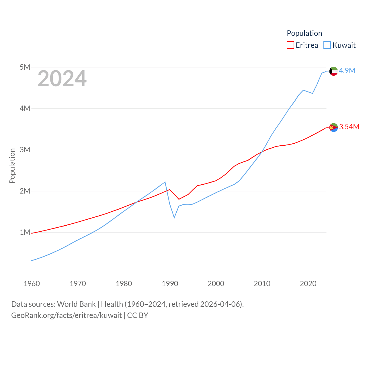 Eritrea has a population of 3.54M (ranked 131/197), compared with 4.9M in Kuwait (ranked 127/197). Eritrea's land area is 46,787 sq mi versus 6,880 sq mi for Kuwait (ranked 96th vs. 153rd).
