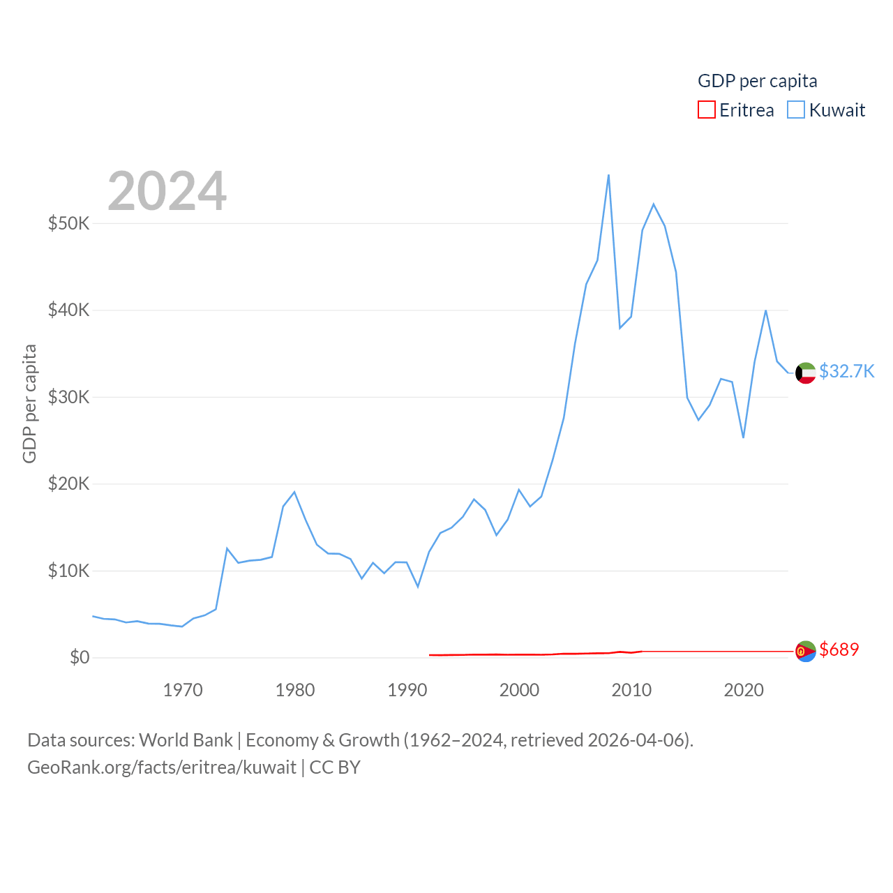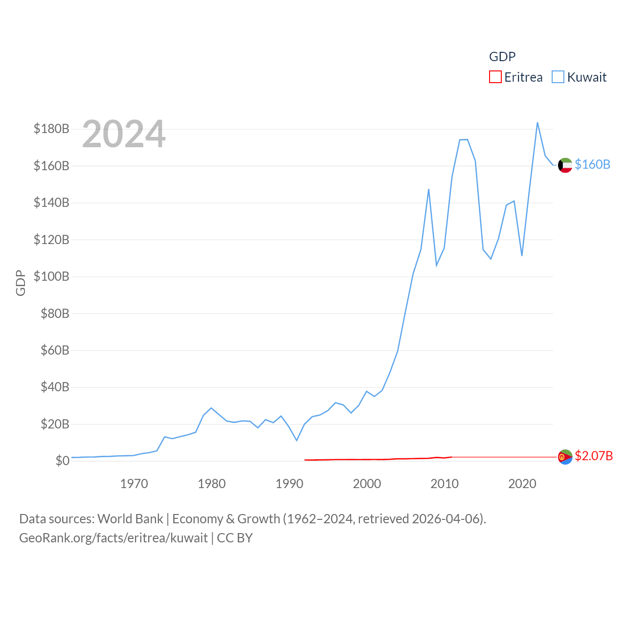By GDP, Eritrea ranks 179/197 ($2.07B) and Kuwait ranks 59/197 ($160B). By GDP per capita, Eritrea ranks 188/197 ($689), while Kuwait ranks 37/197 ($32,718).