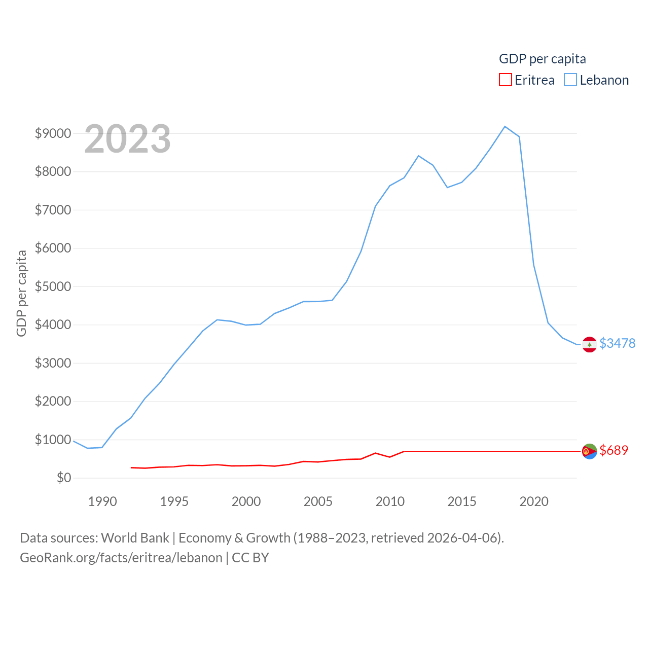 By GDP, Eritrea ranks 179/197 ($2.07B) and Lebanon ranks 128/197 ($20.1B). By GDP per capita, Eritrea ranks 188/197 ($689), while Lebanon ranks 135/197 ($3,478).