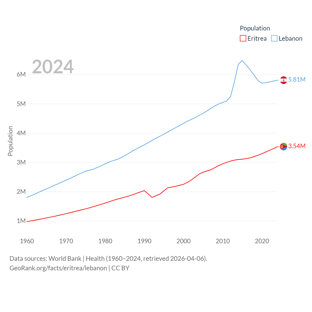 Eritrea has a population of 3.54M (ranked 131/197), compared with 5.81M in Lebanon (ranked 115/197). Eritrea's land area is 46,787 sq mi versus 3,950 sq mi for Lebanon (ranked 96th vs. 160th).