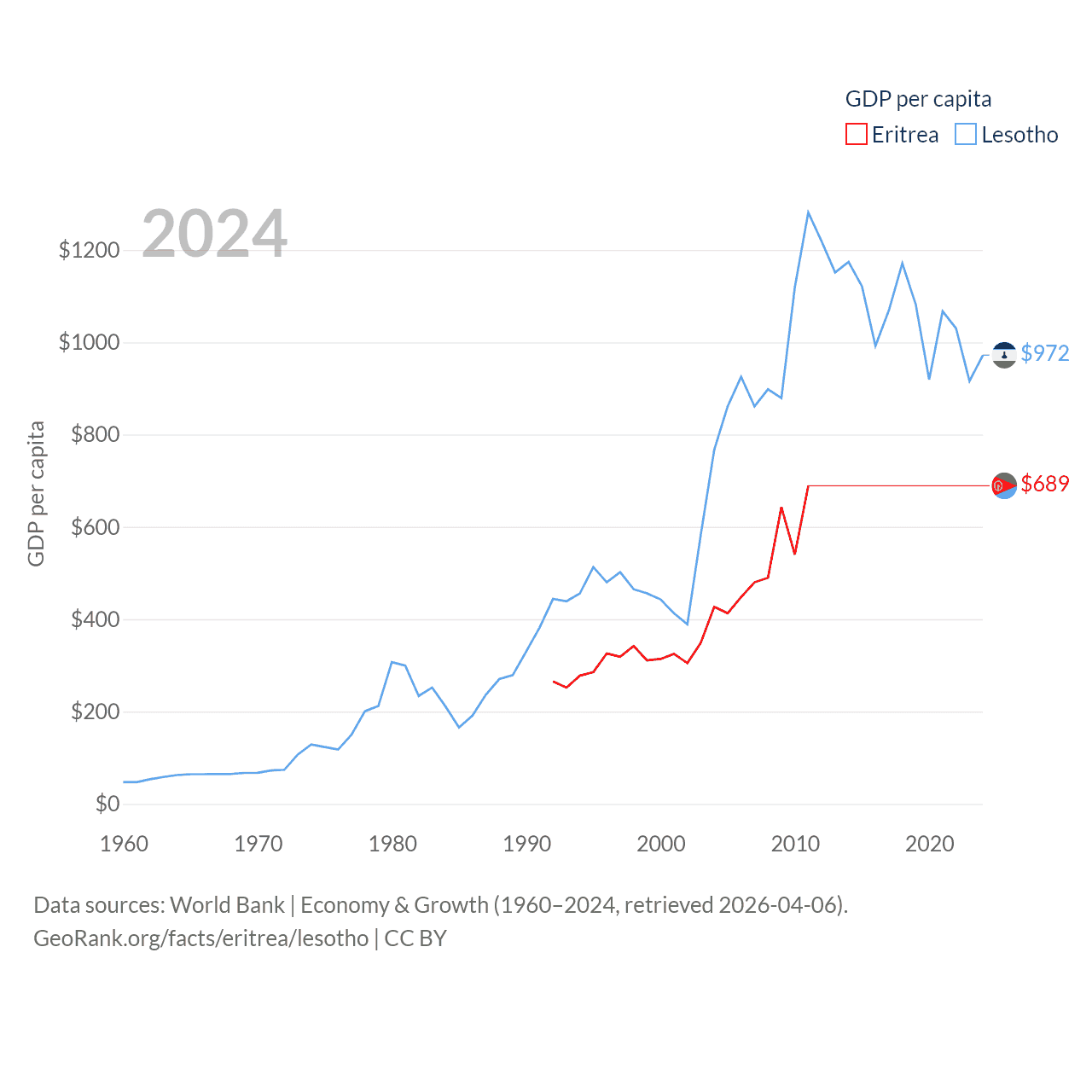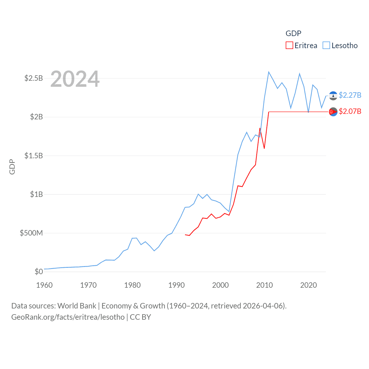By GDP, Eritrea ranks 179/197 ($2.07B) and Lesotho ranks 175/197 ($2.27B). By GDP per capita, Eritrea ranks 188/197 ($689), while Lesotho ranks 181/197 ($972).