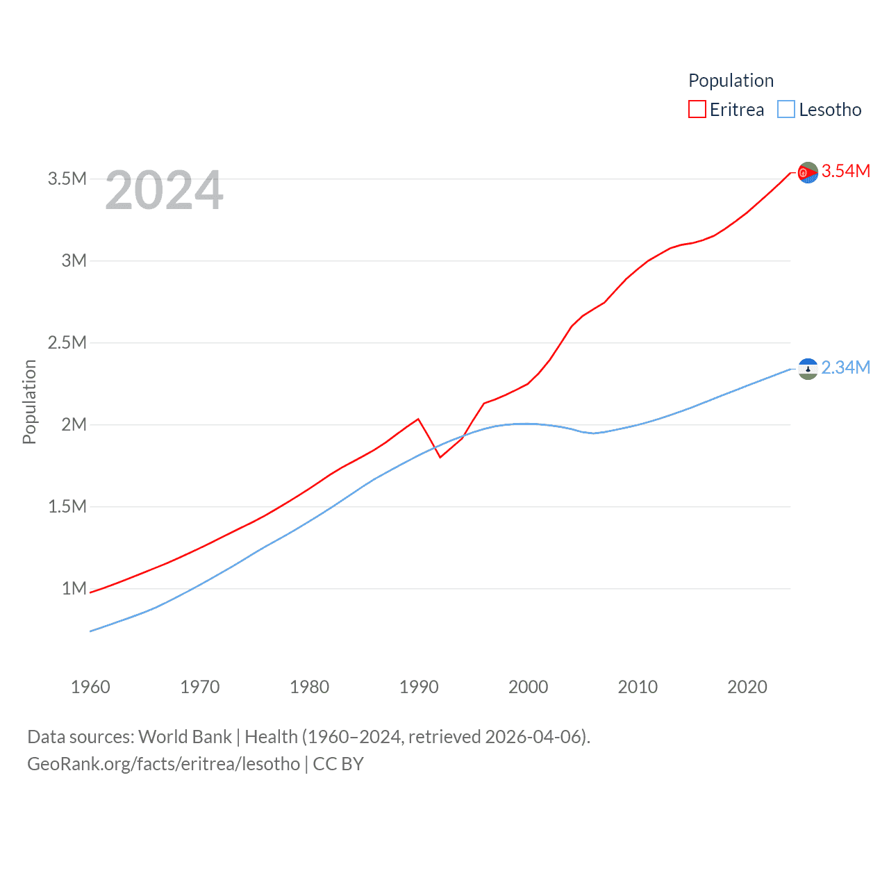 Eritrea has a population of 3.54M (ranked 131/197), compared with 2.34M in Lesotho (ranked 145/197). Eritrea's land area is 46,787 sq mi versus 11,722 sq mi for Lesotho (ranked 96th vs. 137th).