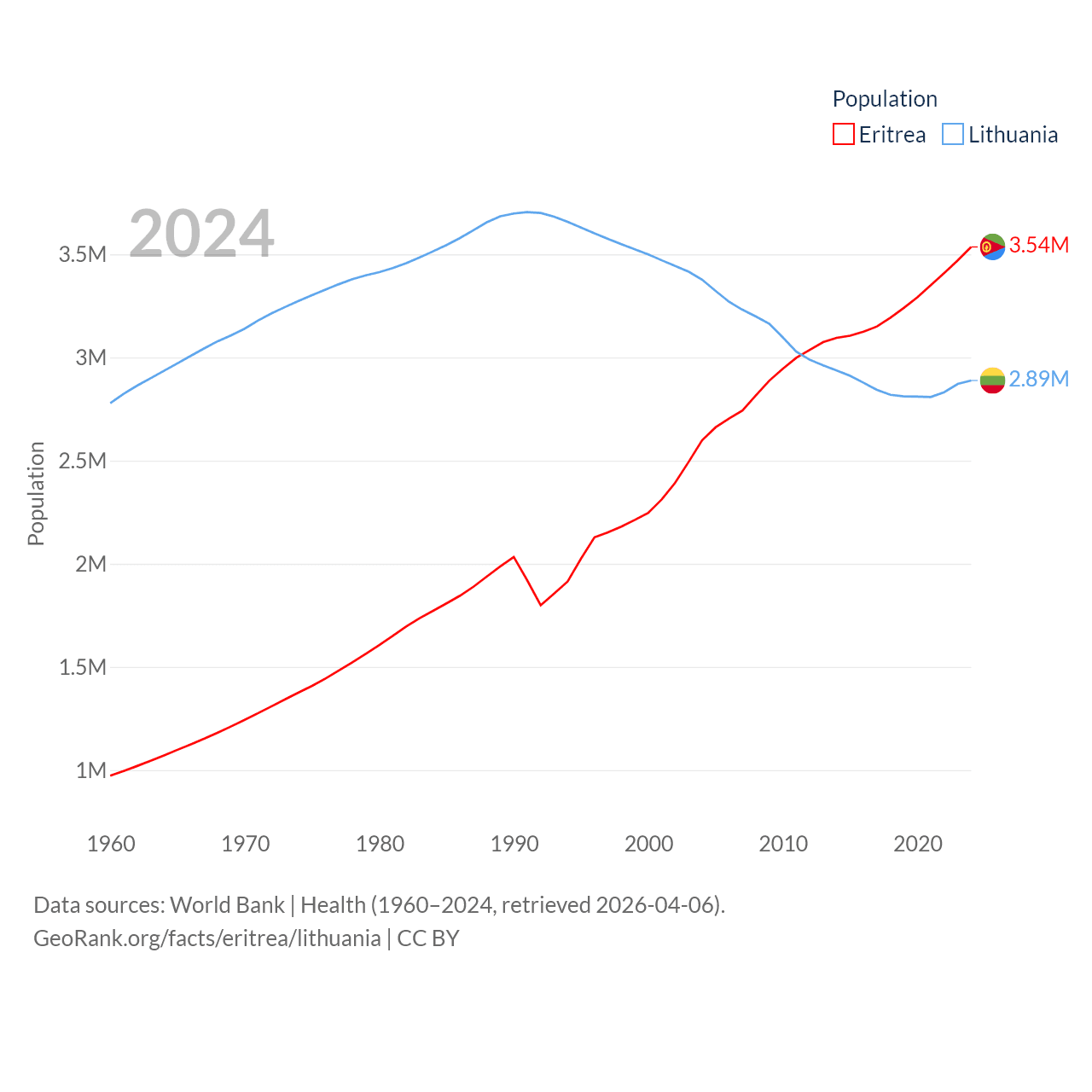 Eritrea has a population of 3.54M (ranked 131/197), compared with 2.89M in Lithuania (ranked 137/197). Eritrea's land area is 46,787 sq mi versus 24,170 sq mi for Lithuania (ranked 96th vs. 120th).